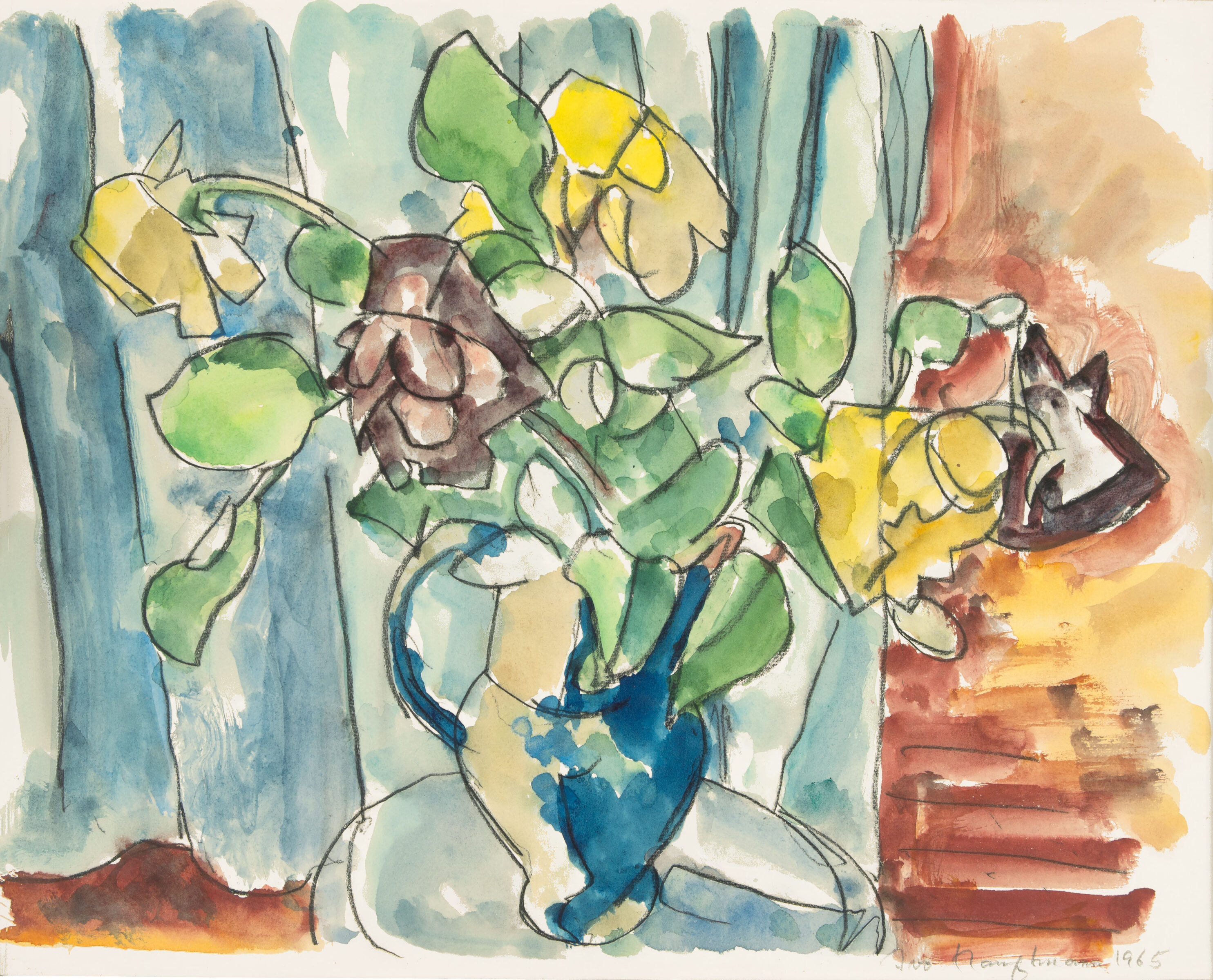Rosen im Krug. Aquarell u. Kreide auf Büttenkarton. 1965. 38,5 x 47 cm, unter Passepartout. Unter Glas gerahmt.