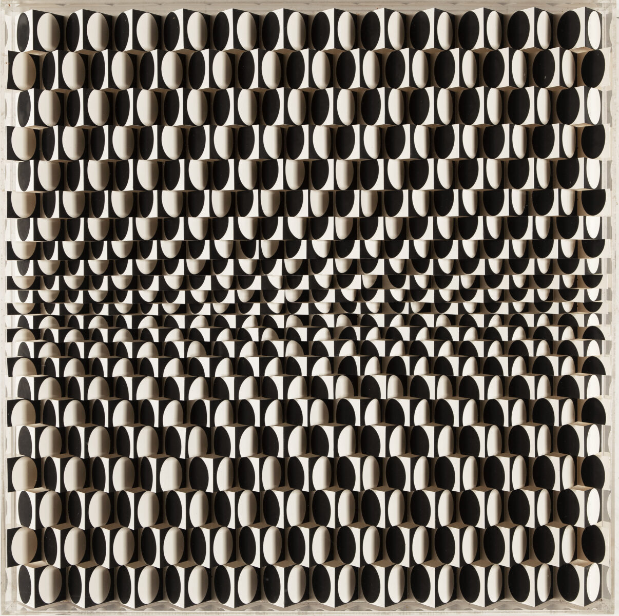 o.T. (Optisches Relief, Flächenverlauf). Schwarzweißer Karton, gefaltet u. verklebt, in Plexiglaskasten. 1970. 61,1 x 60,9 x 6,1 cm.