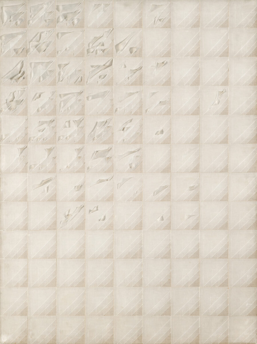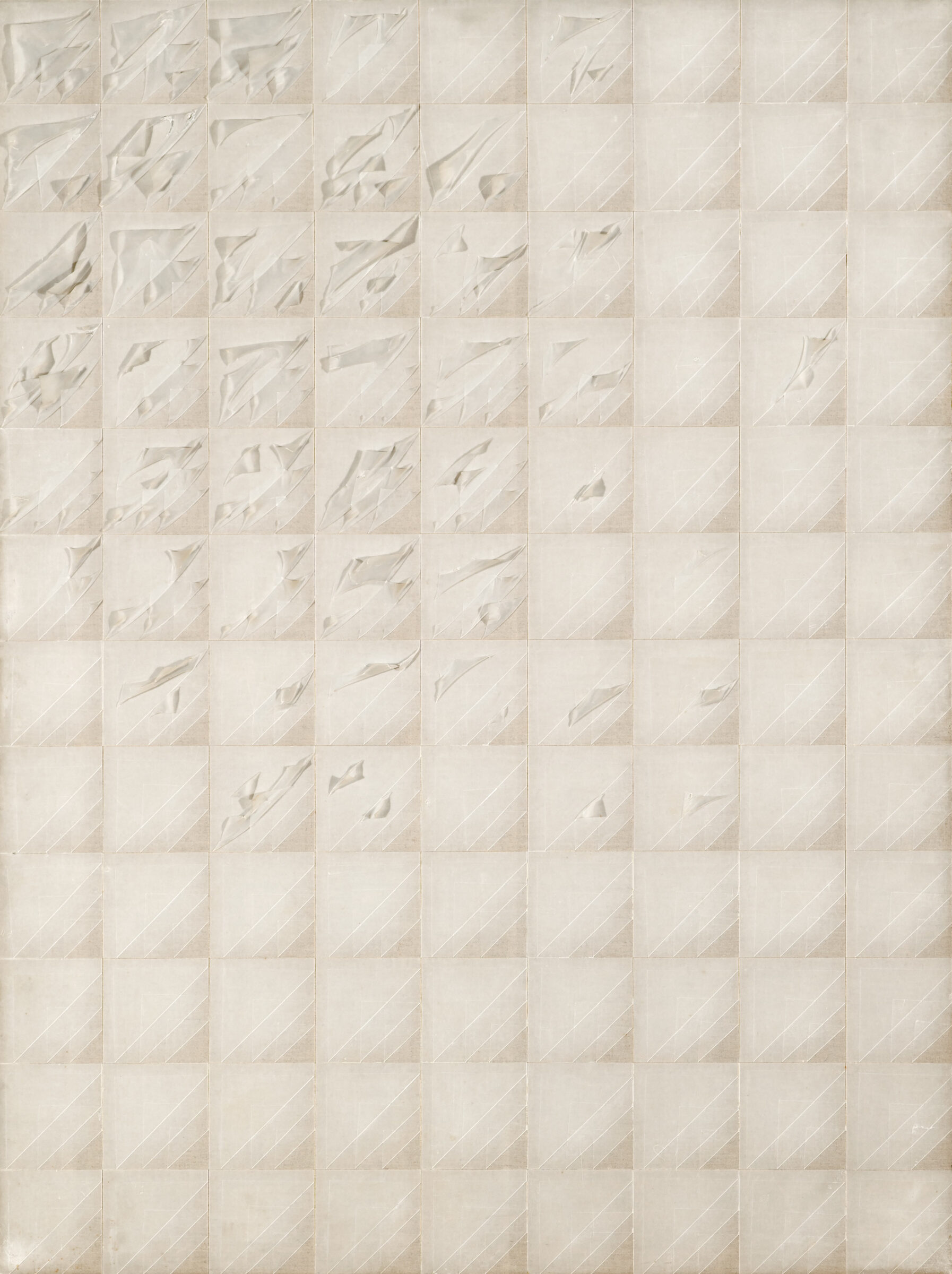 o.T. (Struktur). Kunstharzkleber über gefaltetem u. collagiertem Transparentpapier auf Leinwand auf Holz. In Kasten mit entspiegeltem Museumsglas. 1975. 120 x 90 cm.