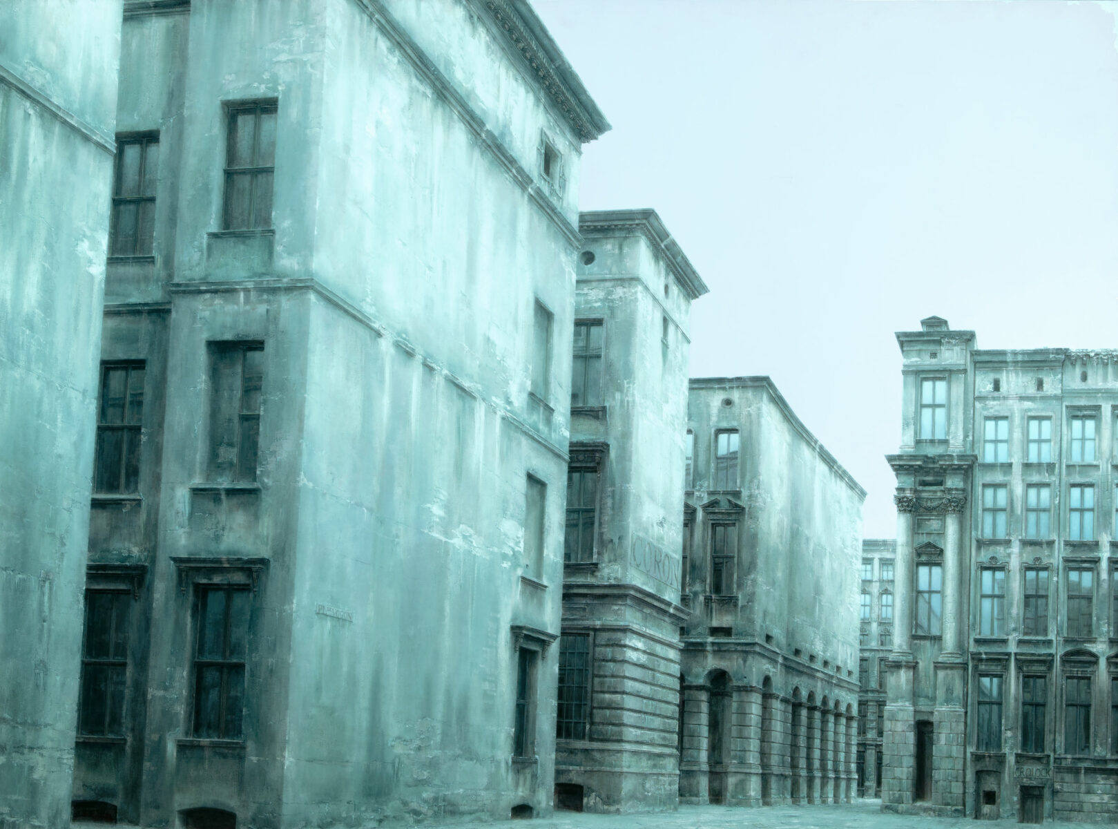 Vogon Plaza. Öl auf Leinwand auf Polyvinyl. 1994. 140 x 189 cm. In Künstlerleiste gerahmt.