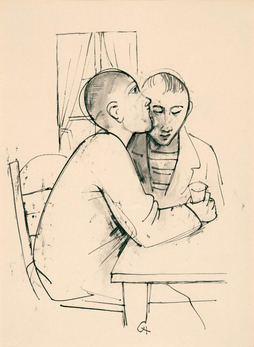 Zwei Männer im Gespräch. Feder u. Pinsel in Tusche auf chamoisfarbenem festen Papier. 1920er Jahre. 54 x 35 cm, unter Passepartout. Unter Glas gerahmt.