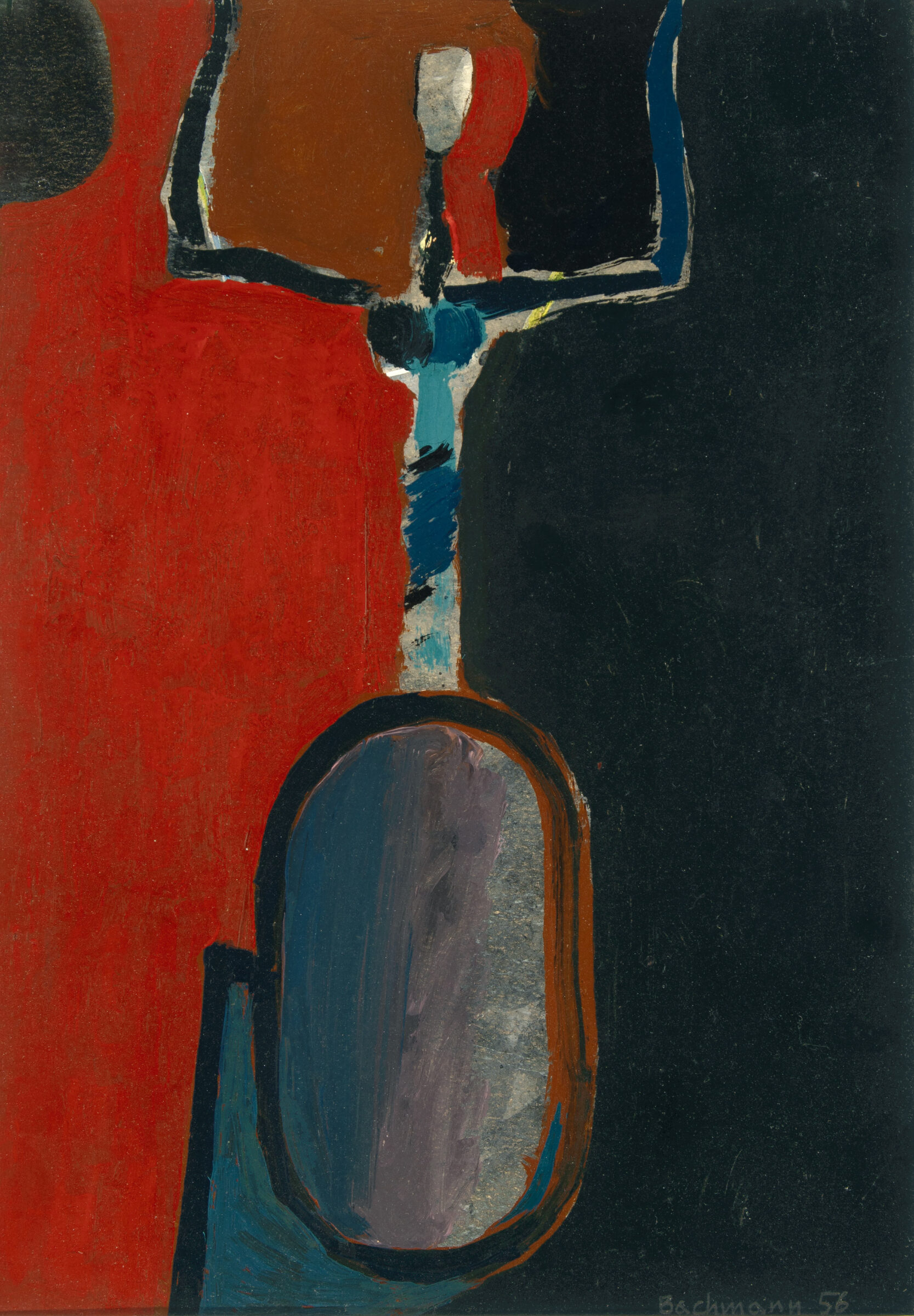 o.T. (Spiegelfrau in Rot). Öl auf bräunlichem Karton. 1956. 30 x 21,3 cm, unter Passepartout. Unter Glas gerahmt.