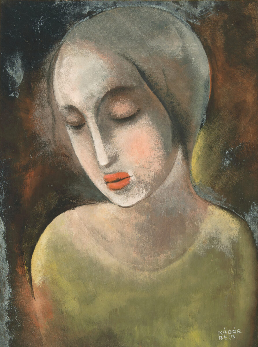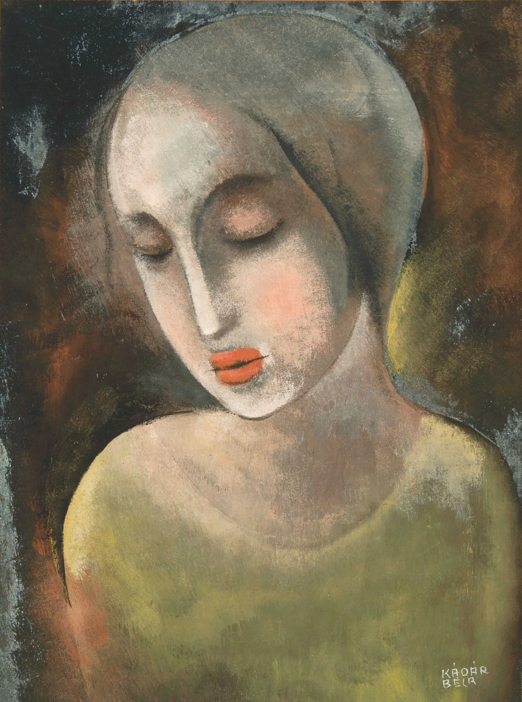 o.T. (Mädchen mit gesenktem Blick). Gouache u. schwarze Kreide auf Papier auf Karton montiert. 44,3 x 32,9 cm. Unter Glas gerahmt.