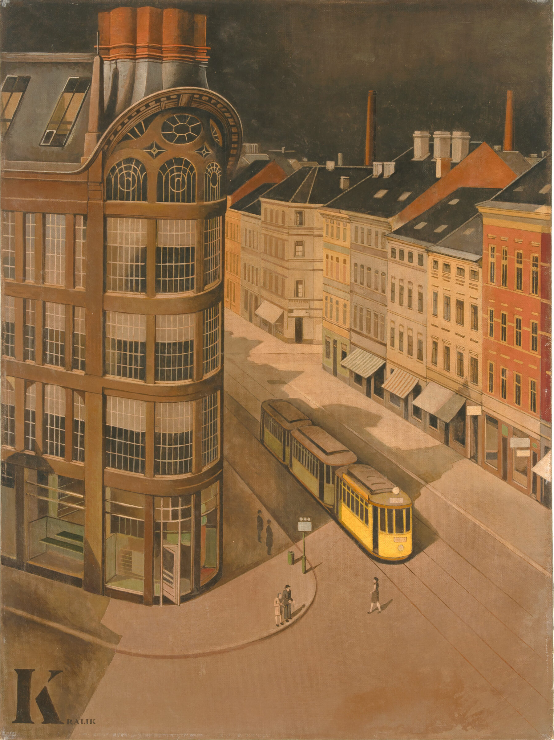 Ausgestellt und abgebildet in: Hanns Kralik. Mensch - wie stolz das klingt. Kunst und Politik. Moers, Grafschafter Museum im Moerser Schloss, 2023, Abb. 16, S. 118. - Typisch für Kralik ist die kühle Klarheit seiner Kompositionen, die exakte Perspektive und eine gewisse Leere oder Entrücktheit, die trotz der Präsenz von Menschen und Bewegung (wie etwa der Straßenbahn) nie ganz ins Erzählerische kippt. Statt emotionaler Überhöhung oder expressiver Farbigkeit dominieren bei Kralik Ruhe, Struktur und eine sachlich-analytische Beobachtung. Seine Stadtansichten, wie unser Gemälde "Aus meinem Fenster", sind Momentaufnahmen urbaner Topografie, die Architektur, Licht und menschliches Verhalten in ein sorgfältig austariertes Gleichgewicht setzen. Bewusst schneidet er den turmartigen Aufsatz des Gebäudes ab und stellt den Laden im Erdgeschoss leer dar, um diesen Eindruck zu verstärken. - Damit reiht sich Kralik in eine Gruppe von Künstlern der Rheinregion, die in den 1920er und 1930er Jahren neue Wege suchten: darunter Franz Radziwill, dessen Werk zwischen Technikbegeisterung und Unheilsvorahnung pendelte. In Düsseldorf selbst wirkten zur gleichen Zeit Maler wie Werner Heuser oder die Gruppe "Das Junge Rheinland", die in den 1920er Jahren eine dynamische Avantgarde bildeten, aus der später auch differenzierte Positionen der Neuen Sachlichkeit hervorgingen.