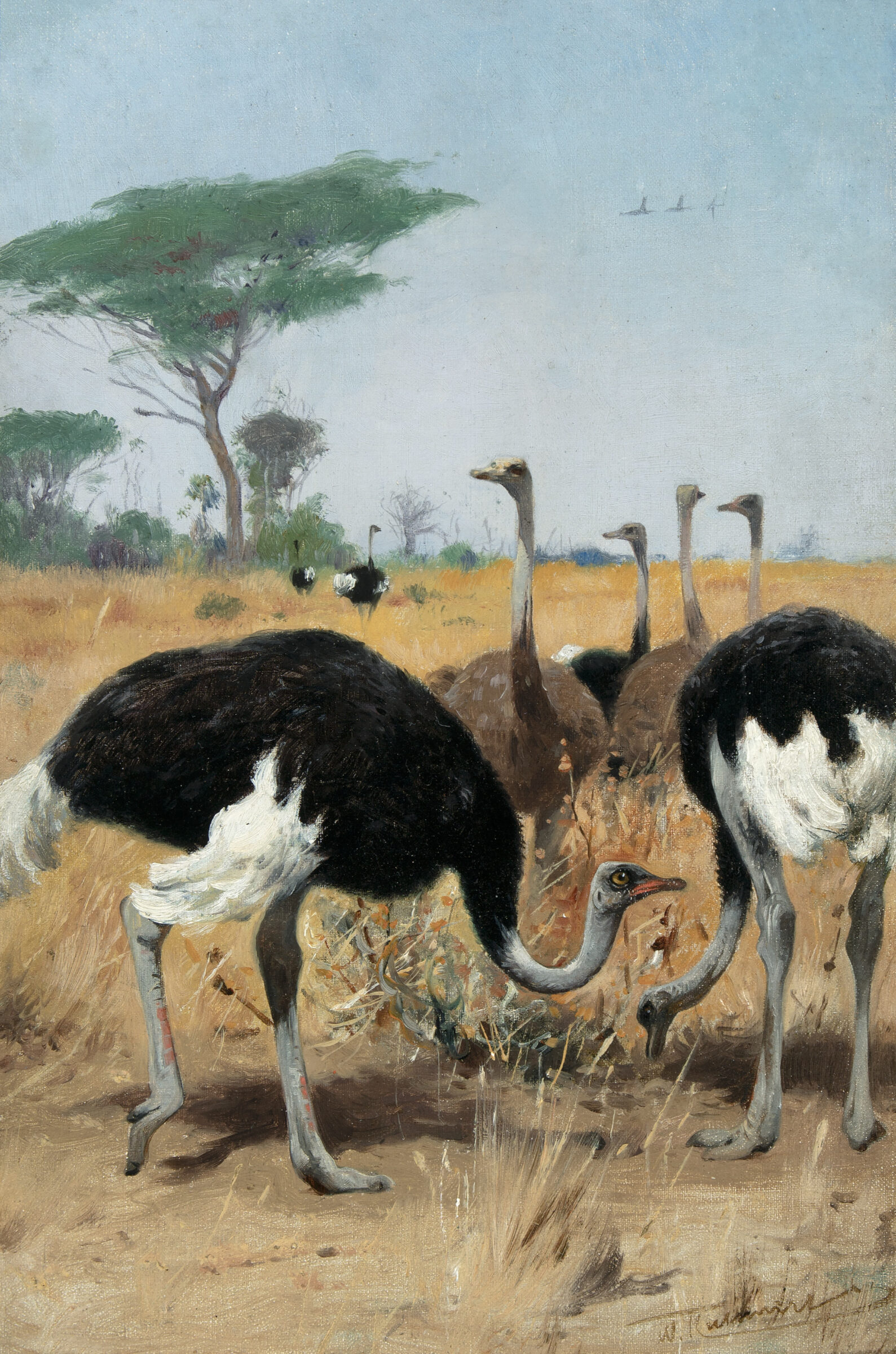 Straußenherde. Öl auf Leinwand auf fester Pappe. 31,8 x 21,5 cm. Gerahmt.
