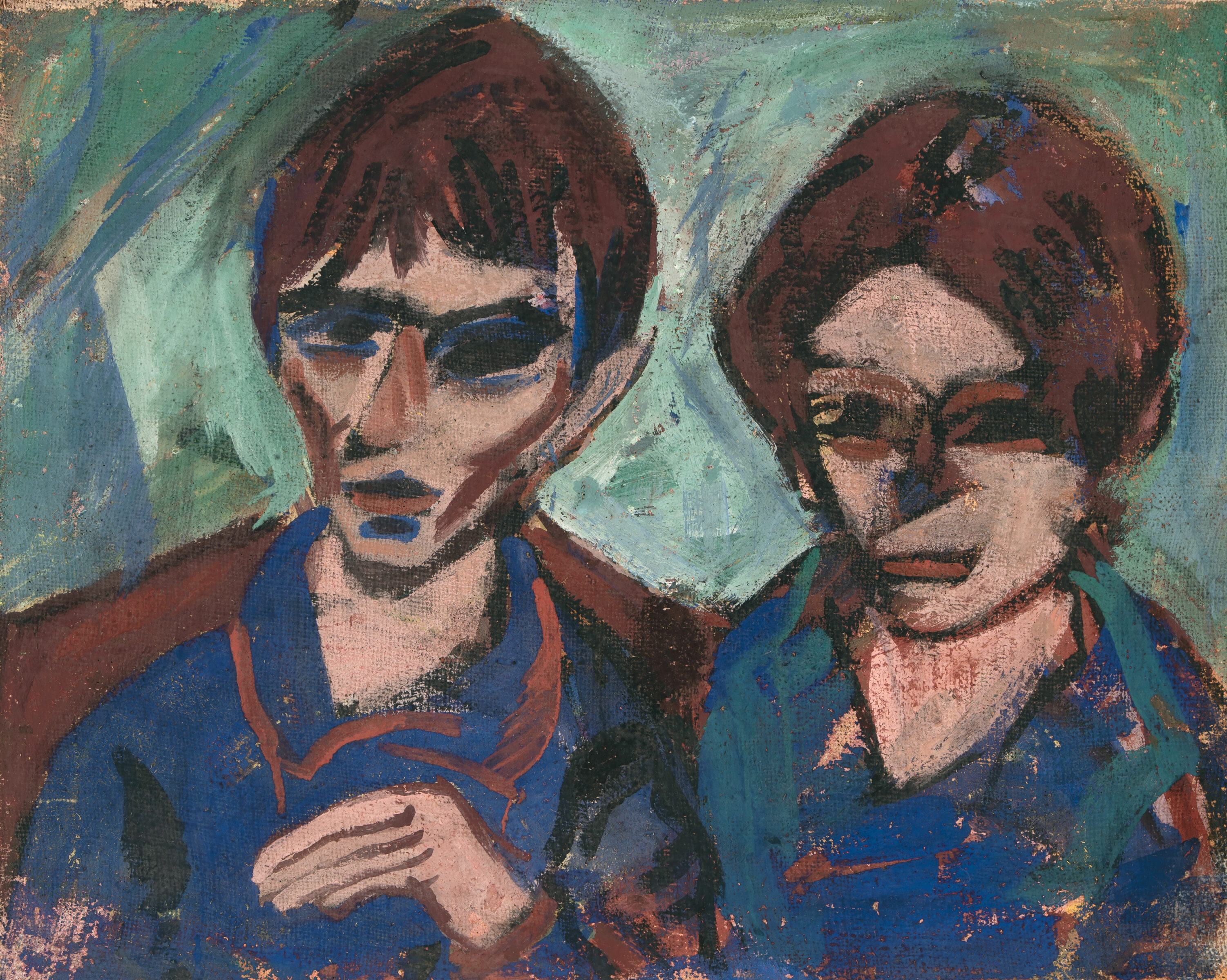 Die Arbeit wird in das Werkverzeichnis des Künstlers aufgenommen. Wir danken Torsten Sabatier, Verden, für die freundlichen Auskünfte. - Provenienz: Privatsammlung Süddeutschland (seit Ende der 1920er Jahre in Familienbesitz); Privatsammlung Hessen. - Paul Kother und Otto Mueller lernten sich 1896 in Dresden in der Malklasse von Carl Bantzer kennen. 1909 heiratete Kother Muellers Schwester Martha. In vorliegendem Doppelporträt zeigt Kother seinen Schwager mit dessen Ehefrau Maschka in einer stillen, introvertierten Zweisamkeit. Diese doppelte Nähe - biografisch wie emotional - prägt die besondere Intensität des Bildes. Kother verzichtet auf eine repräsentative Pose oder dekorative Ausgestaltung. Stattdessen rückt er die psychologische Präsenz der beiden Figuren in den Vordergrund. Die Gesichter sind kantig modelliert, von kräftigen Konturen und expressiven Farbkontrasten bestimmt. Blau- und Grüntöne dominieren die Komposition und verleihen ihr eine kühle, fast entrückte Atmosphäre, die durch die dunklen, ernsten Augenpartien noch verstärkt wird. Otto Mueller erscheint nach innen gekehrt, mit angespannt erhobener Hand, während Maschka ruhiger und gefasster wirkt. Kother gelingt es, die unterschiedlichen seelischen Zustände beider Figuren sichtbar zu machen, ohne sie voneinander zu isolieren. Vielmehr entsteht ein Spannungsfeld zwischen Nähe und Eigenständigkeit, das für die Darstellung moderner Paarbeziehungen ebenso charakteristisch ist wie für den Geist des Expressionismus. - Die untere rechte Ecke mit einer leichten Läsur.
