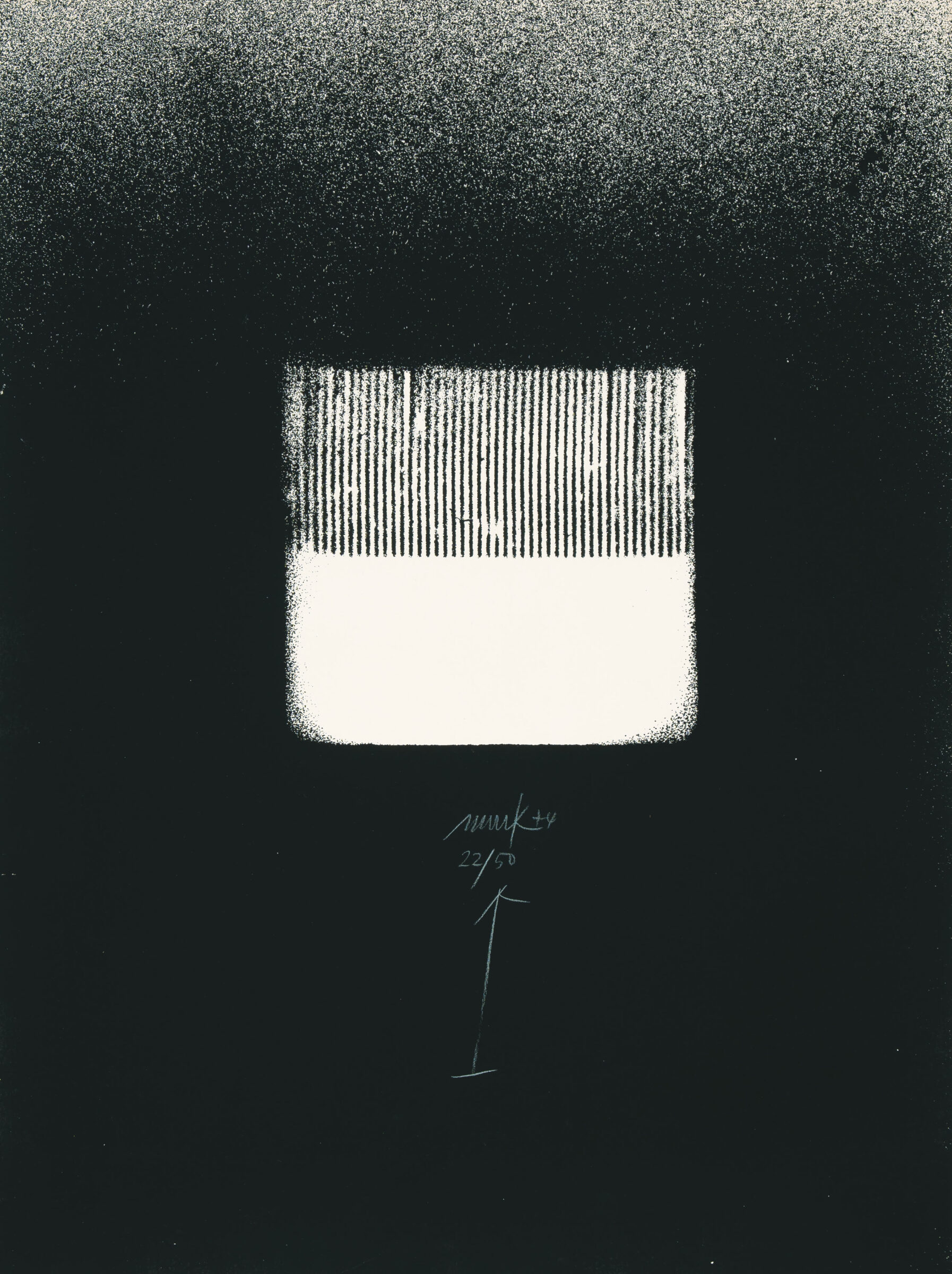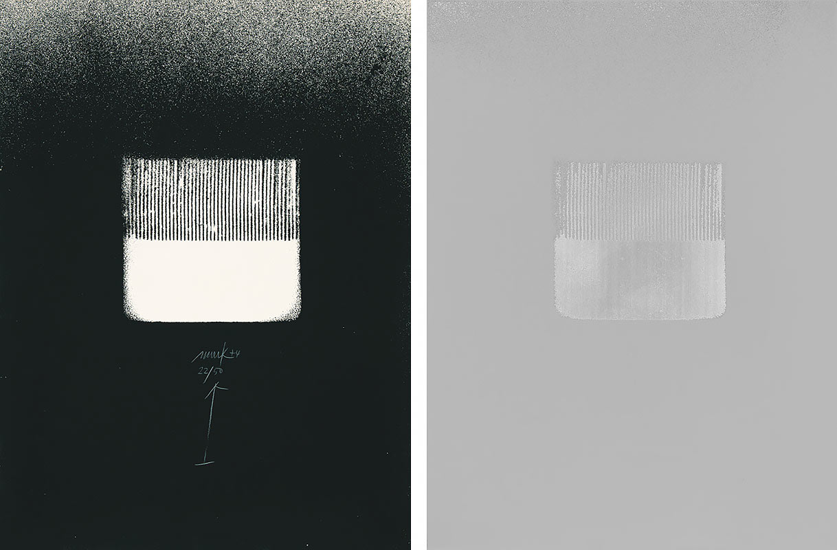 Zwei Blatt Siebdrucke aus der Serie "Struttura di Luce". Auf Karton bzw. mit Aluminiumfolie kaschiertem Karton. 1974. Jeweils 59 x 44 cm (Darstellung u. Blatt) sowie unter Glas gerahmt.