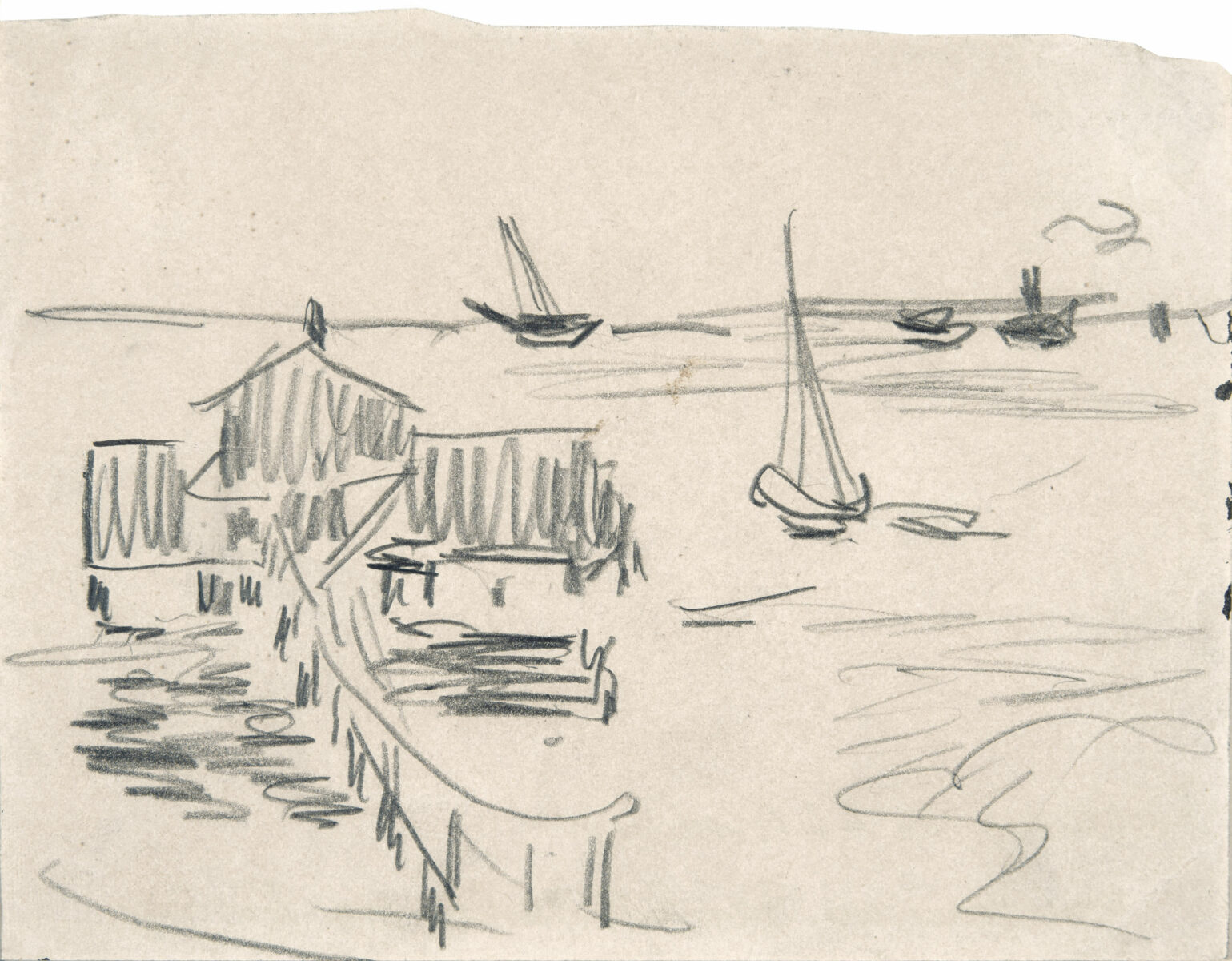 An der See. Bleistift auf Papier. Um 1912/13. 12,5 x 16,3 cm, unter Passepartout. Unter Glas gerahmt.