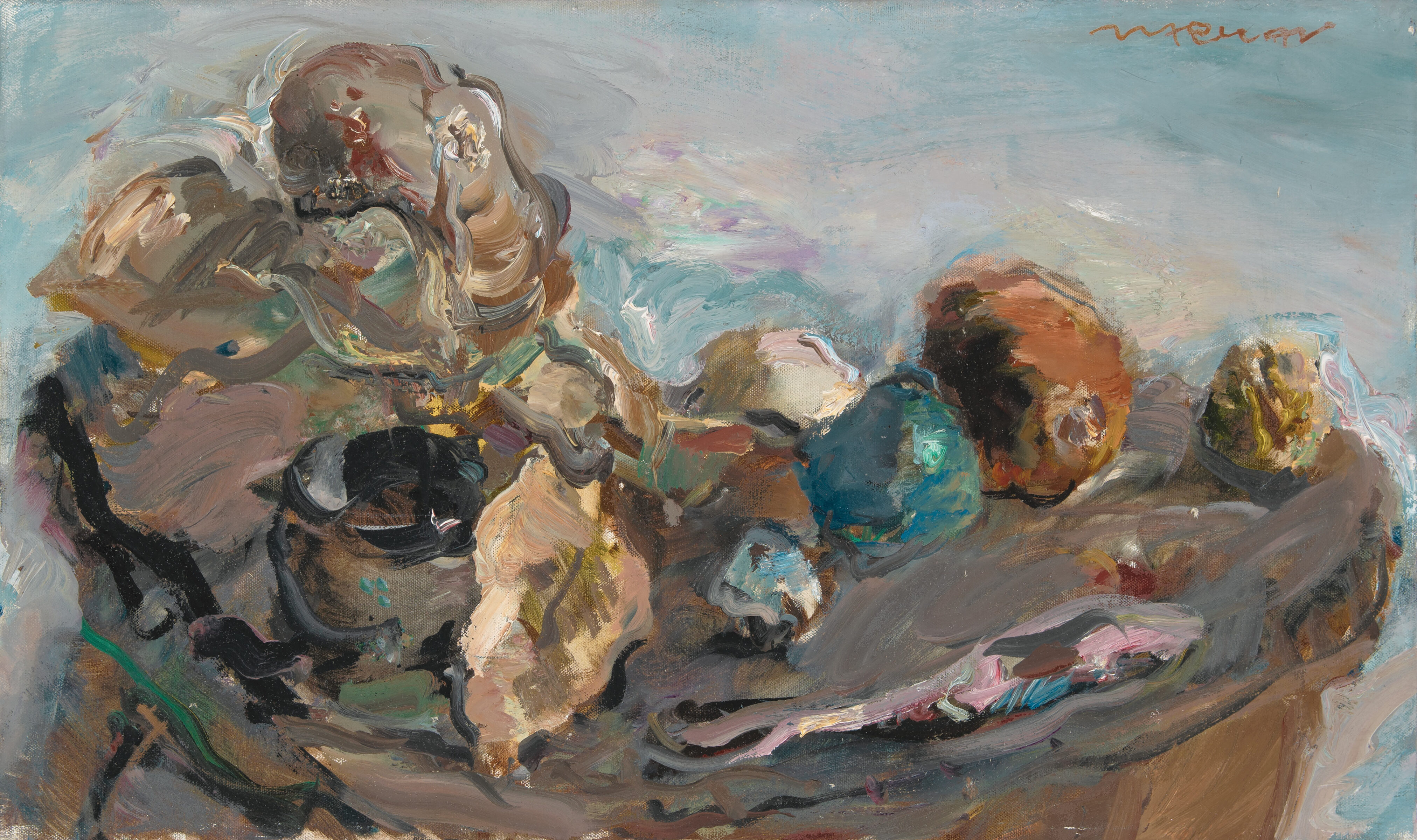 Provenienz: Atelier des Künstlers; Privatsammlung Berlin. - Ausgestellt und abgebildet in: Marwan. Ölbilder und Arbeiten auf Papier aus zwei Sammlungen und zwei Jahrzehnten. Berlin, Dr. Irene Lehr Kunsthandel, 2002, Katalog-Nr. 21, S. 30. - Die rechte obere Ecke mit einem winzigen Farbverlust.