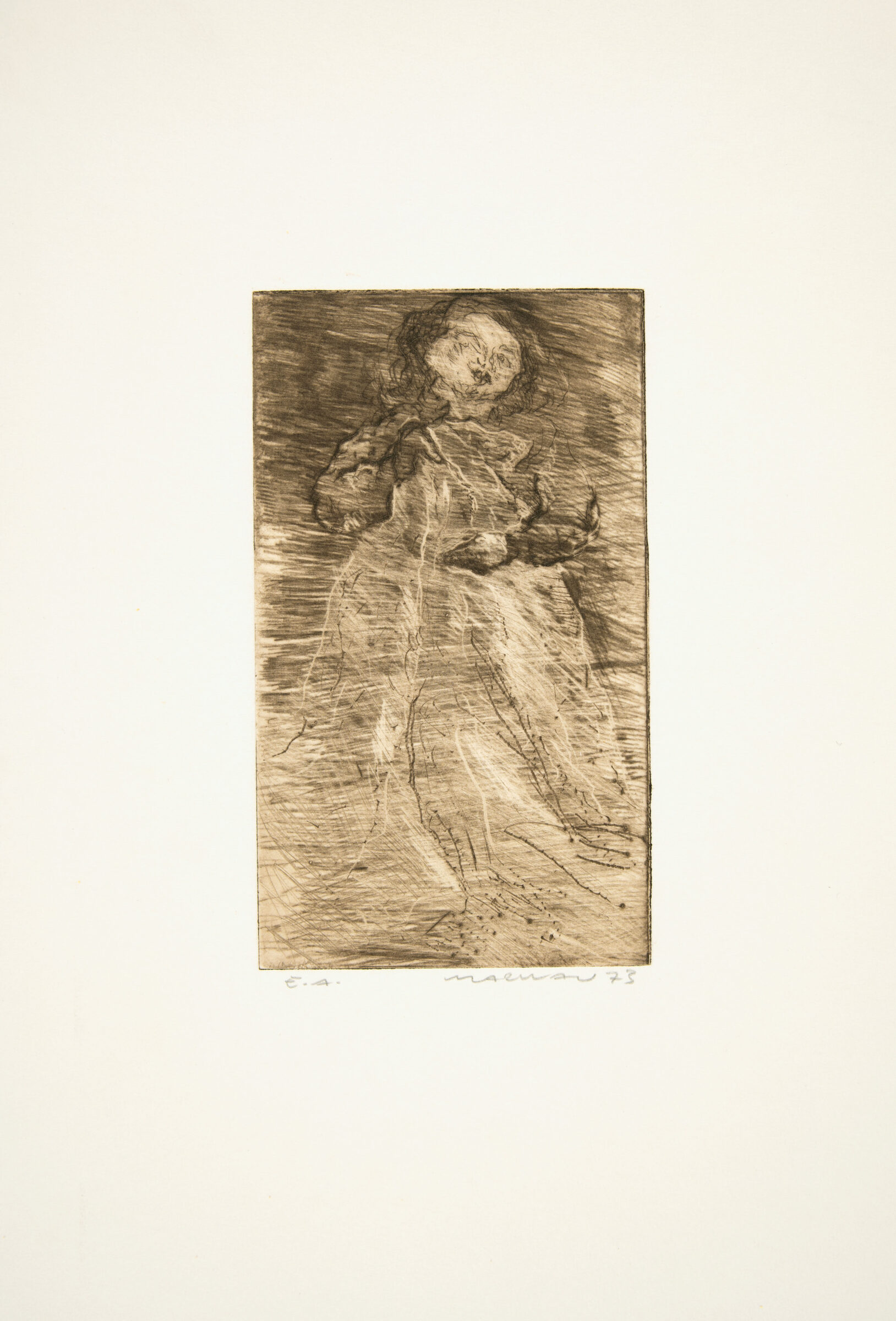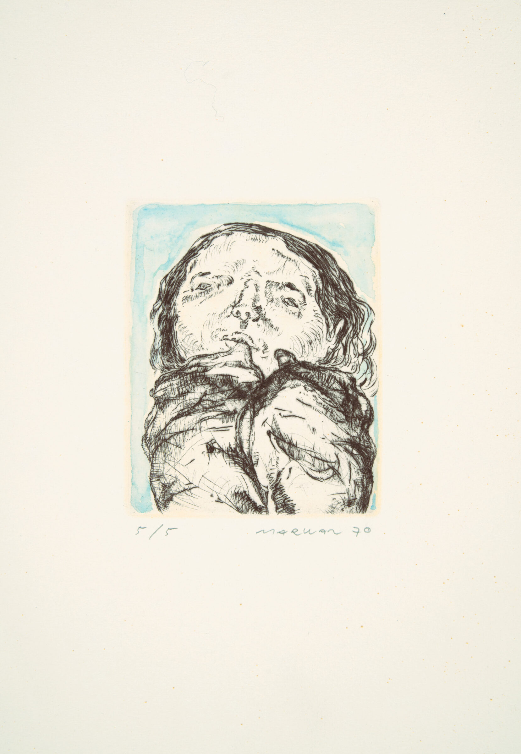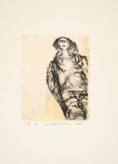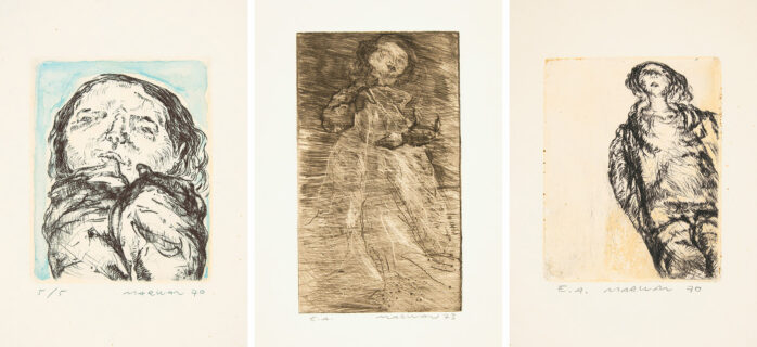 o.T. (Figuren). Drei Blatt Radierungen, davon eines aquarelliert, auf Büttenkarton. 1970/73. 13 x 10,5 (38 x 28,8); 13,3 x 10,5 (38 x 28,8) bzw. 16 x 9,3 (38 x 28,8) cm.