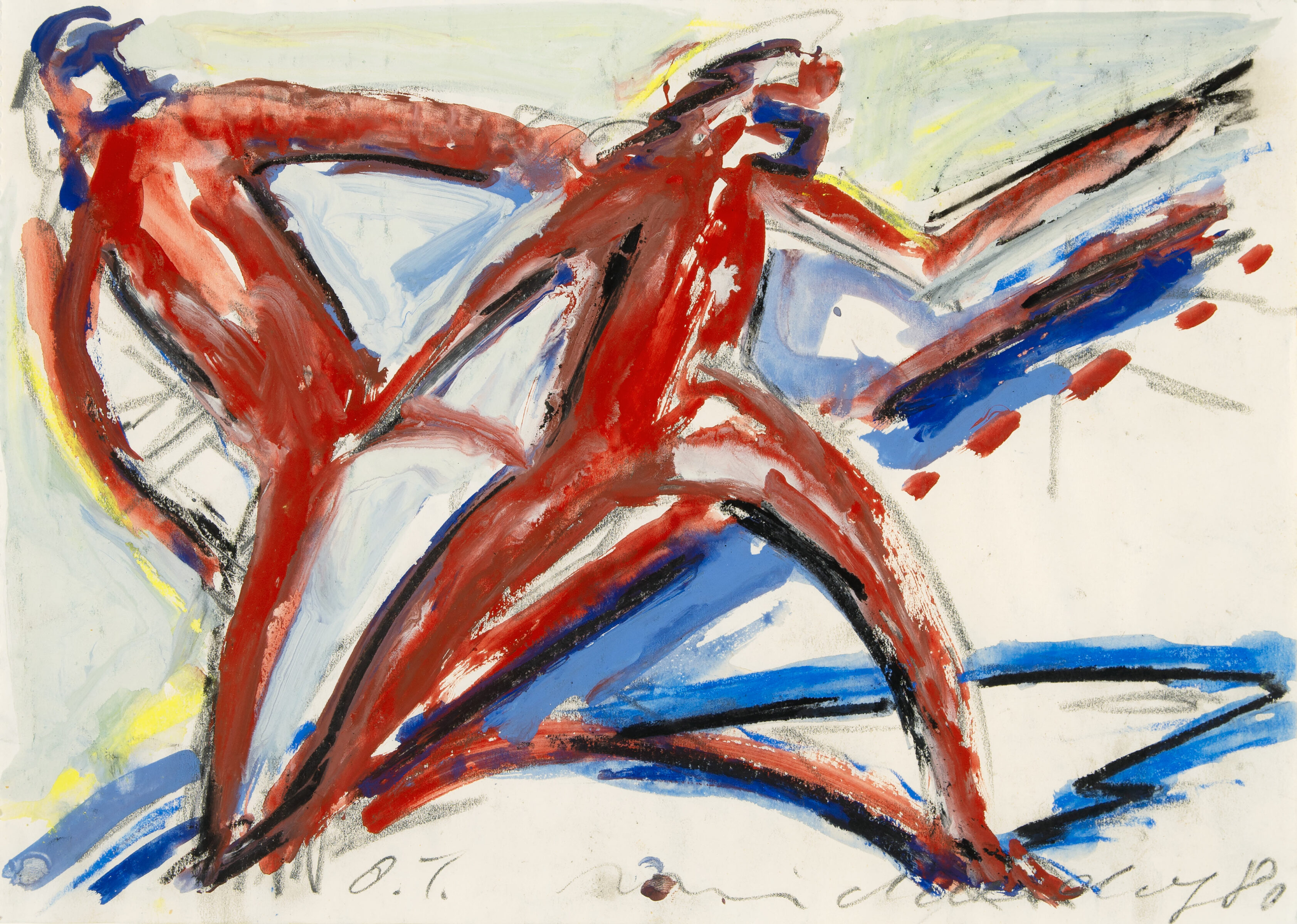 o.T. (Tänzer). Gouache u. Pastell auf Papier. 1980. 29,5 x 41 cm, im Passepartout freigestellt. Unter Glas gerahmt.