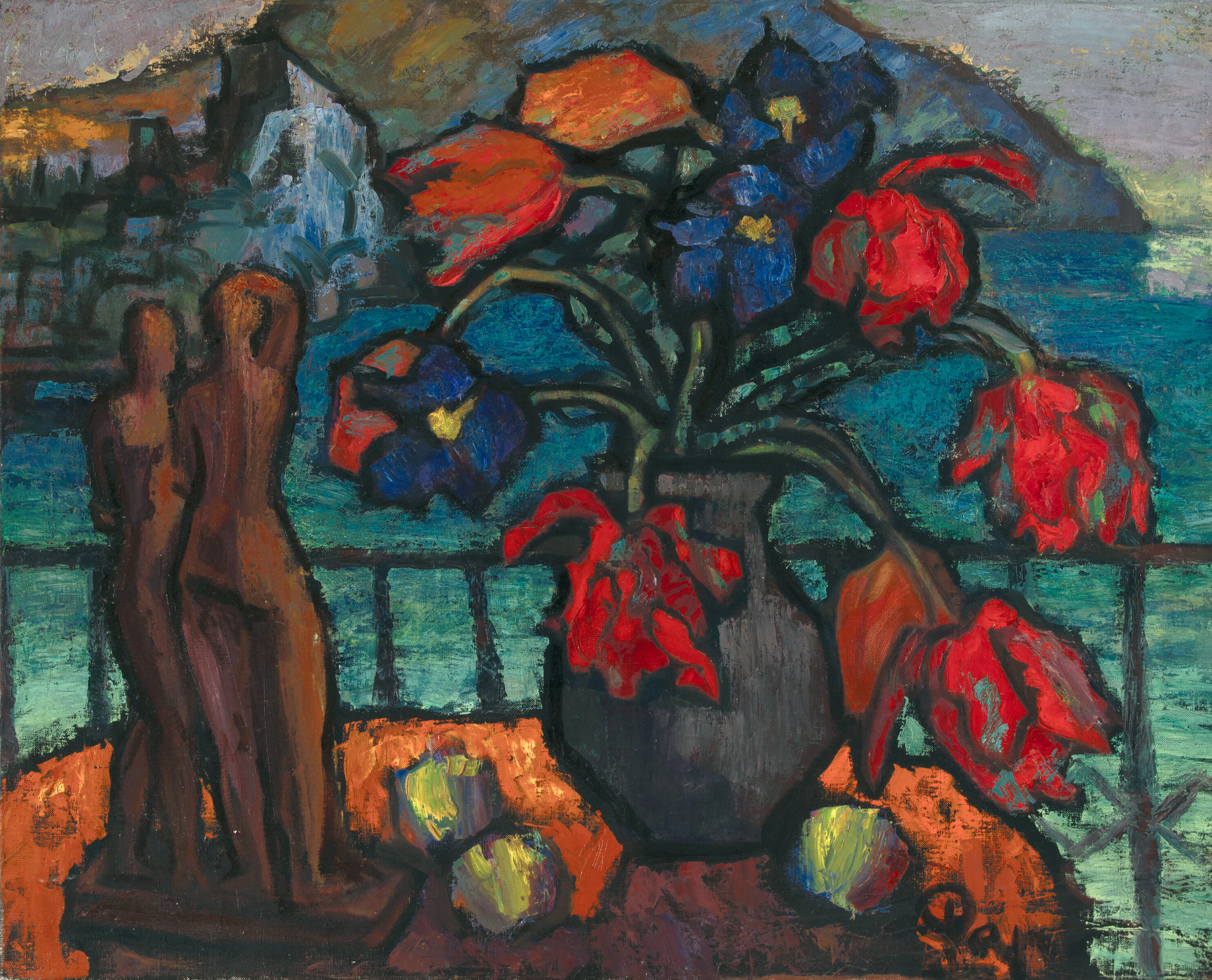 Balkonblick auf den Plattensee (mit Blumen und Figurinen im Vordergrund). Öl auf Leinwand. 1970. 80 x 100 cm. Gerahmt.