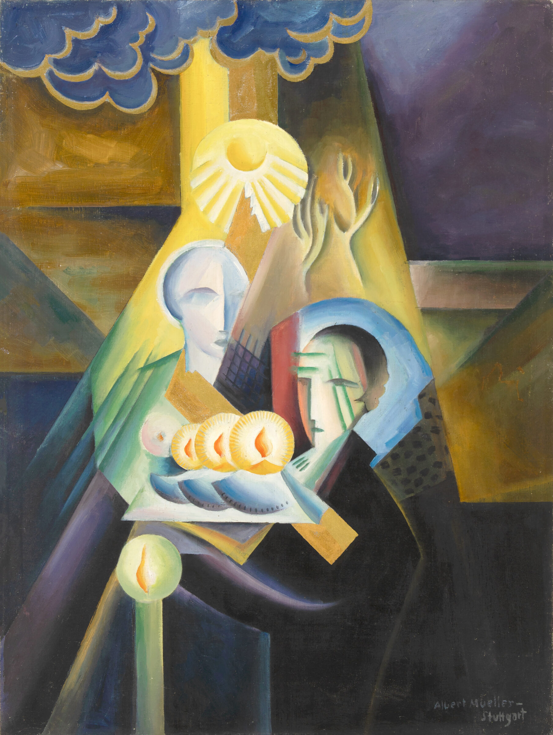 Abgebildet in: Kuno Schlichtenmaier und Alexander Klee, Albert Mueller. Leben und Werk. Stuttgart 1992, Katalog-Nr. 184, S. 144. - Als Meisterschüler Adolf Hölzels gehörte Albert Mueller zusammen mit Willi Baumeister, Johannes Itten, Gottfried Graf, Oskar Schlemmer und weiteren Künstlern zum bekannten Stuttgarter Hölzel-Kreis, welcher die Klassische Moderne zu Beginn des 20. Jahrhunderts in Deutschland entscheidend beeinflusste und prägte. Nach dem Ersten Weltkrieg der expressiven Formensprache sowie vermehrt religiösen Motiven verpflichtet, gründete Mueller 1919 unter anderem gemeinsam mit Gottfried Graf die Stuttgarter Üecht-Gruppe, eine Ortsgruppe der Novembergruppe. Geprägt durch das Werk Picassos wurden Muellers Arbeiten ab dieser Zeit zunehmend kubistischer. Unser Gemälde "Winter" ist ein frühes Beispiel für diese Schaffensphase und weit mehr als eine Jahreszeitenstimmung. Vielmehr erweist sich das Bild als moderne Anspielung auf die Weihnachtsgeschichte. - Die seitlichen Leinwandränder doubliert. Vereinzelte kleine Retuschen.