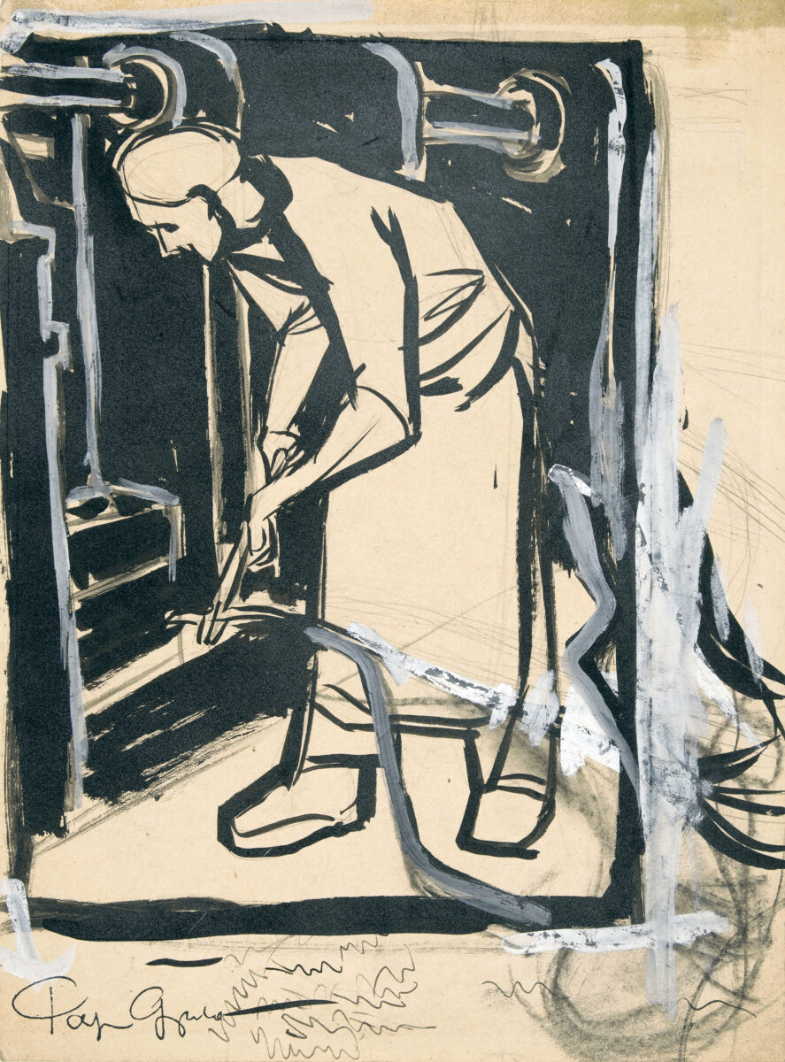 Fabrikarbeiterin am Webstuhl. Gouache, Pinsel in Tusche, Graphit u. Bleistift auf chamoisfarbenem Bütten. 33 x 24,5 cm, unter Passepartout. Unter Glas gerahmt.