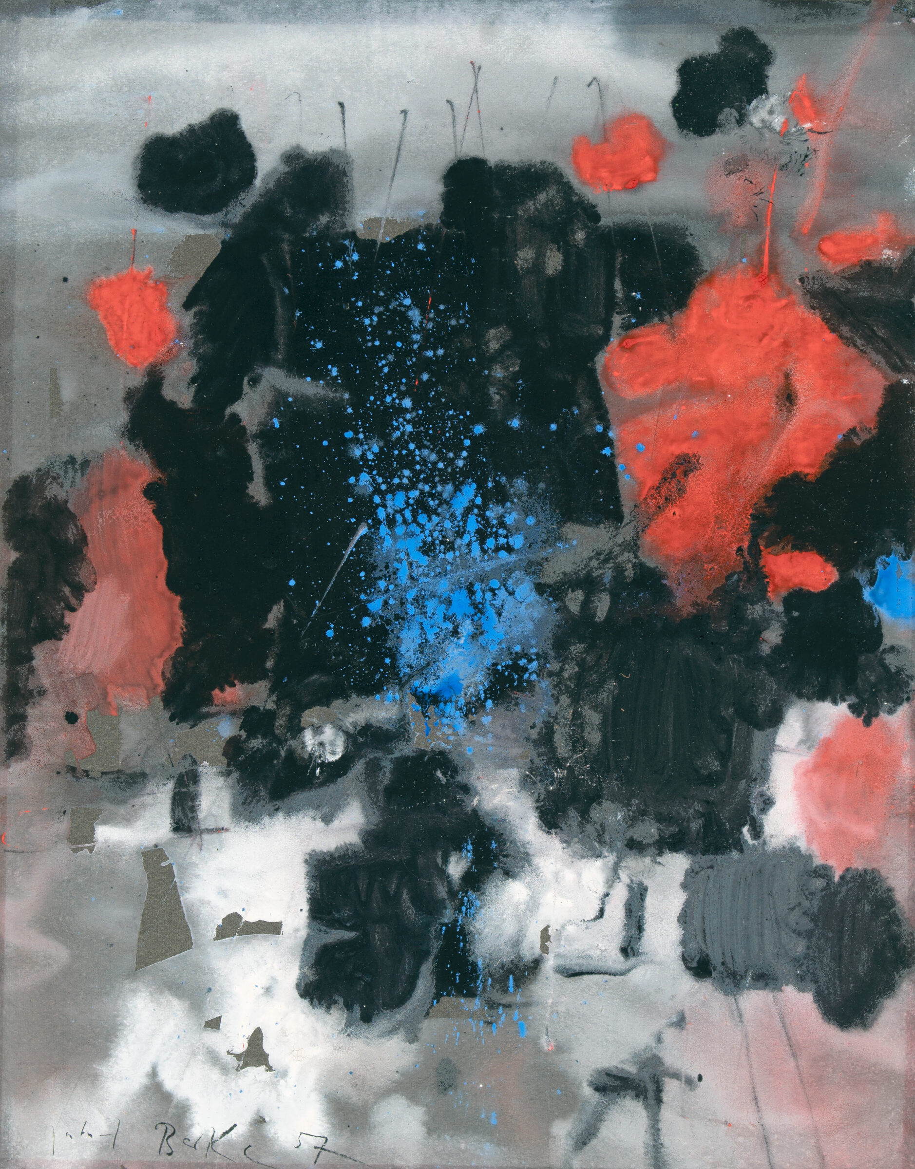 o.T. Gouache auf schwarzem Bütten. 1957. 62,5 x 49,3 cm, unter Passepartout. Unter Glas gerahmt.