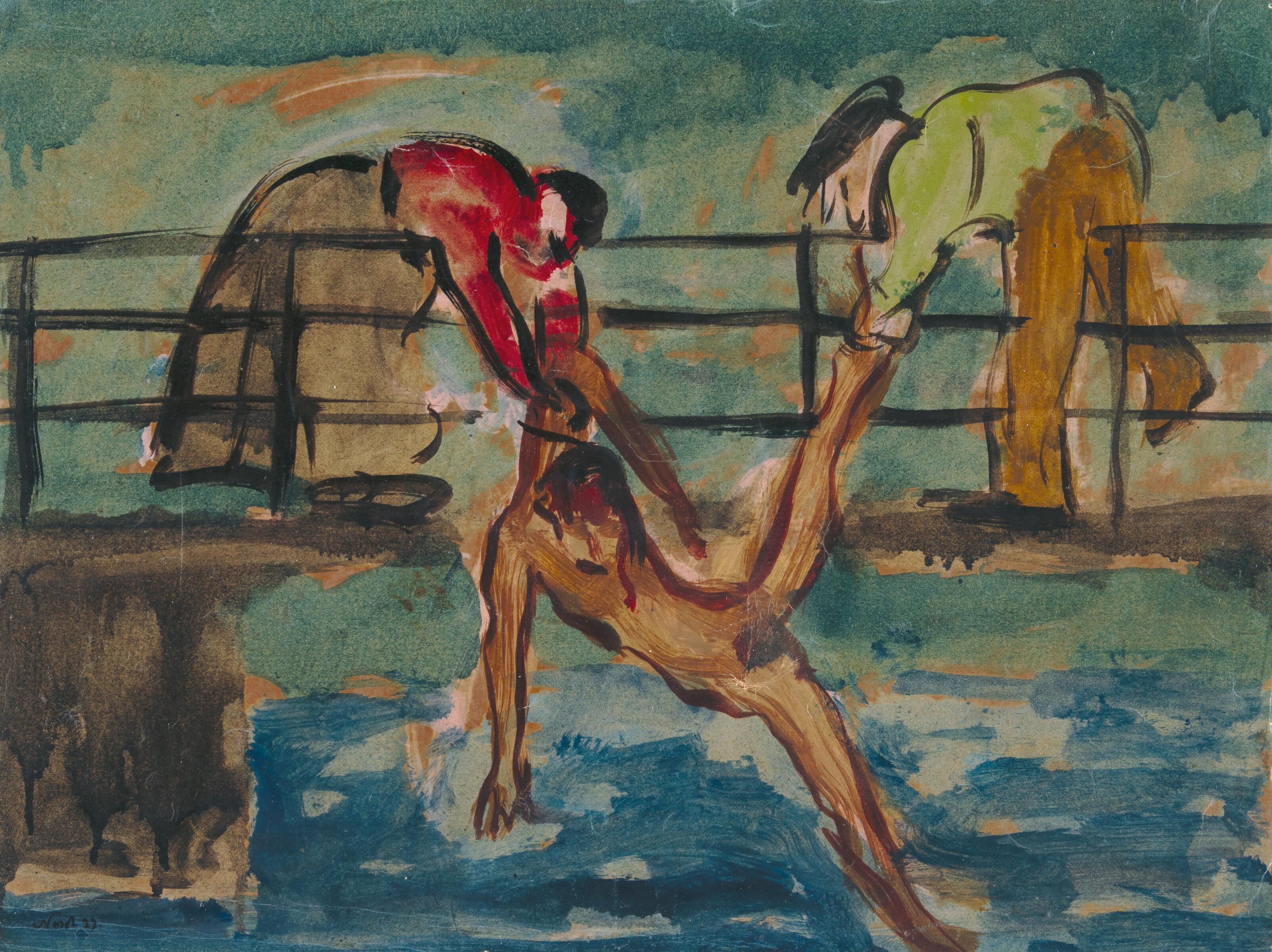 Auf dem Steg. Aquarell auf bräunlichem Papier. 1922. 28,7 x 38,5 cm. Unter Glas gerahmt.