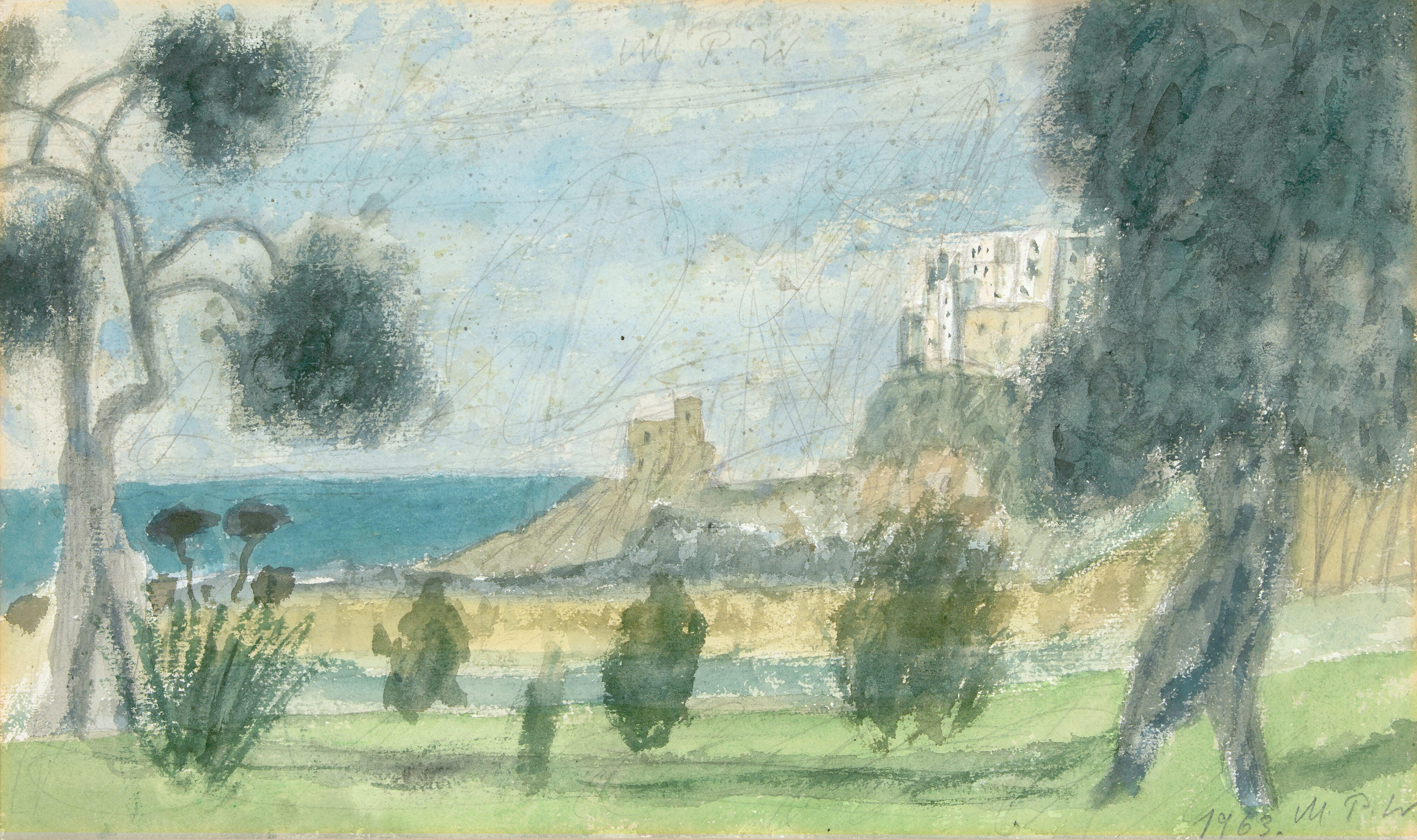 Watenphul-Pasqualucci A 1094 - Ausgestellt in: Max Peiffer Watenphul. Ölbilder, Aquarelle, Lithos. Stuttgart, Galerie Günther Galetzki, 1967, Katalog-Nr. 27 (unter dem Titel "Bei Gaeta") sowie in: Max Peiffer Watenphul. Ölbilder, Aquarelle, Graphik. Baden-Baden, Galerie Elfriede Wirnitzer, 1968. - Minimale Lagerspuren.