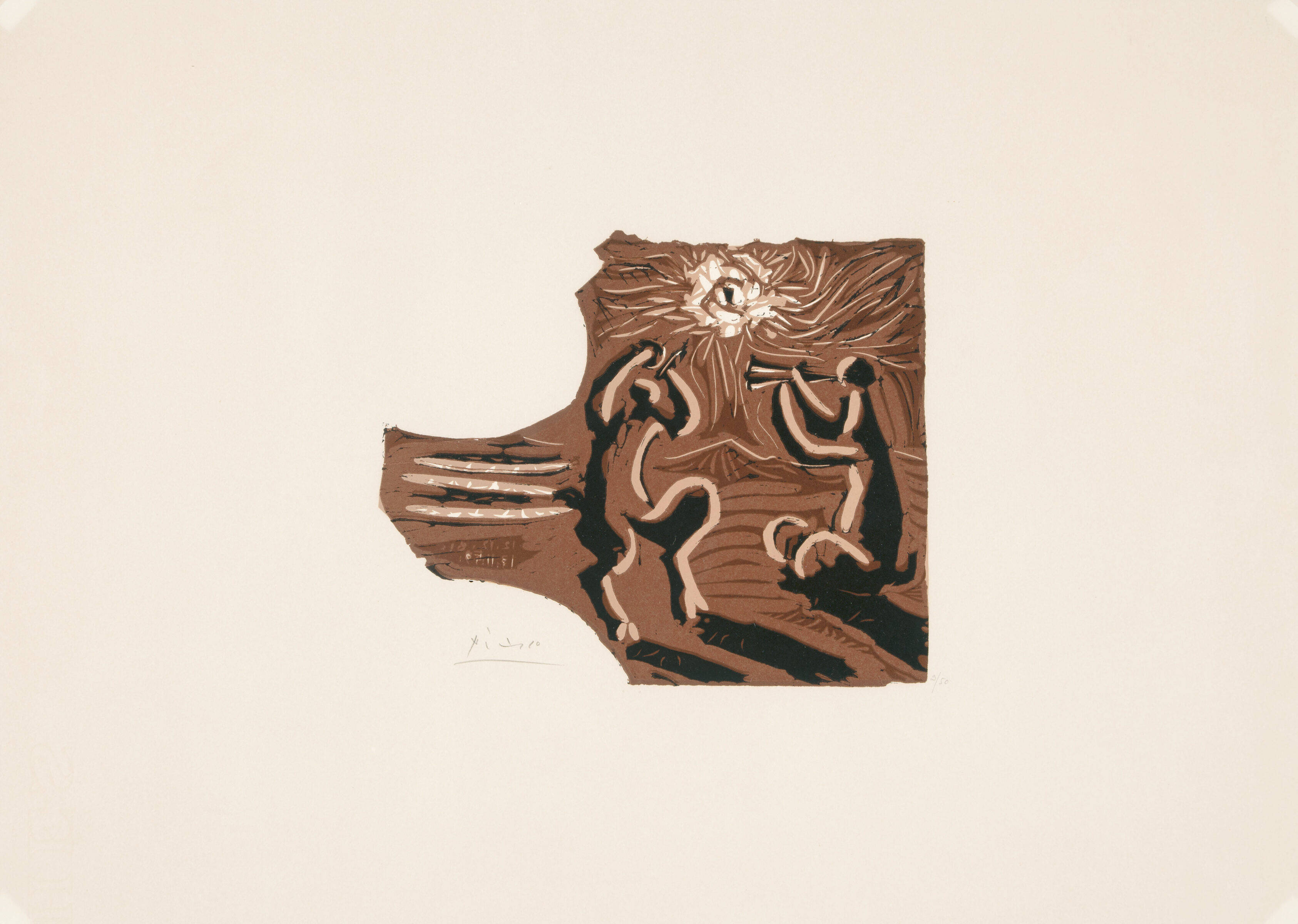 Petite Bacchanale. Farblinolschnitt auf Arches Vélin. 1959-61. 21,8 x 26,5 (45 x 62,8) cm. Unter Glas gerahmt.