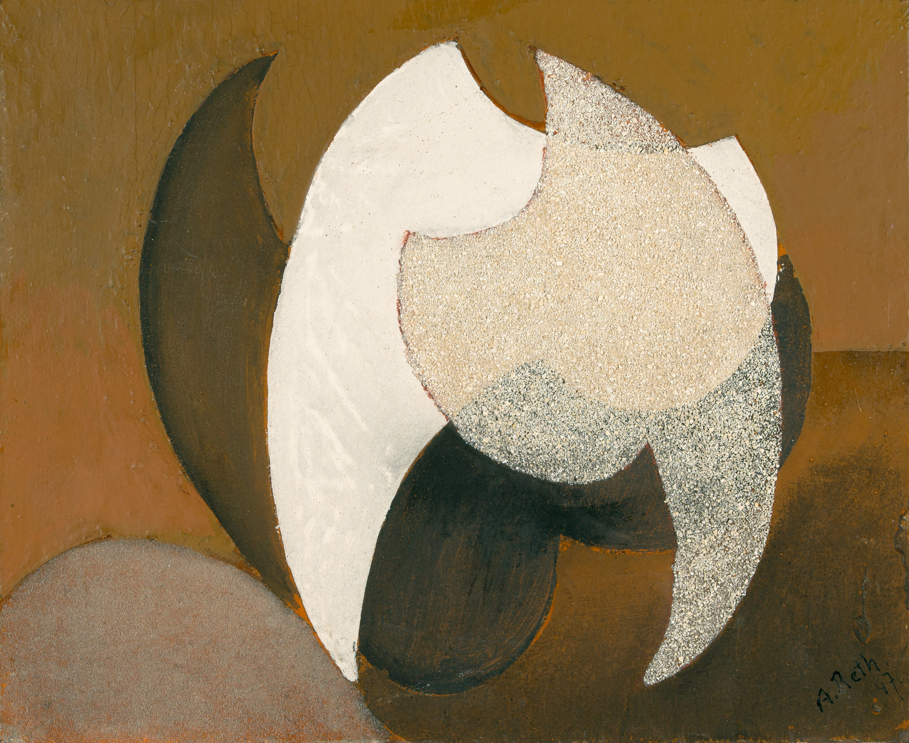 Der ungarisch-französische Maler Alfréd Réth gehört zu den stilistisch vielfältigsten Künstlern der Klassischen Moderne. Ausgehend von frühen Auseinandersetzungen mit dem Kubismus entwickelte er eine eigenständige Bildsprache, in der sich strukturierte Flächen, organische Rundungen und ein sensibles Gespür für Materialität miteinander verbinden. Seine Ausbildung absolvierte er an der Schule von Nagybánya, Paris und Florenz. Nach ersten Ausstellungserfolgen in Paris - Réth präsentierte seine Werke dort unter anderem mit Henri Matisse, Fernand Léger, Jean Metzinger und Georges Braque - zeigte Herwarth Walden 1913 in seiner berühmten Berliner Sturm-Galerie 80 kubistische Arbeiten des Malers. Nach dem Ersten Weltkrieg vollzog er seine Stilentwicklung zur vollständigen Abstraktion, der er bis zu seinem Tod in verschiedenen Ausprägungen treu blieb. Anfang der 1930er Jahre wurde er Mitglied der Künstlervereinigung "Abstraction-Création", der auch Wassily Kandinsky und Hans Arp angehörten und beteiligte sich in den folgenden Jahren an zahlreichen Ausstellungen abstrakter Malerei. Nach dem Zweiten Weltkrieg begann er, verschiedene Materialien von unterschiedlicher Textur in seine Werke zu integrieren. - Stellenweise Craquelé.