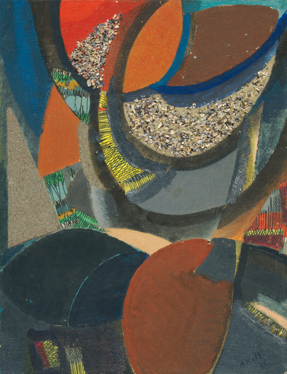 o.T. (Komposition). Mischtechnik (Öl, Quarzsand, Keramiksplitter, Muschelschalen, bemalter Stoff) auf Schichtholz. 1962. 65,5 x 50 cm. Gerahmt.