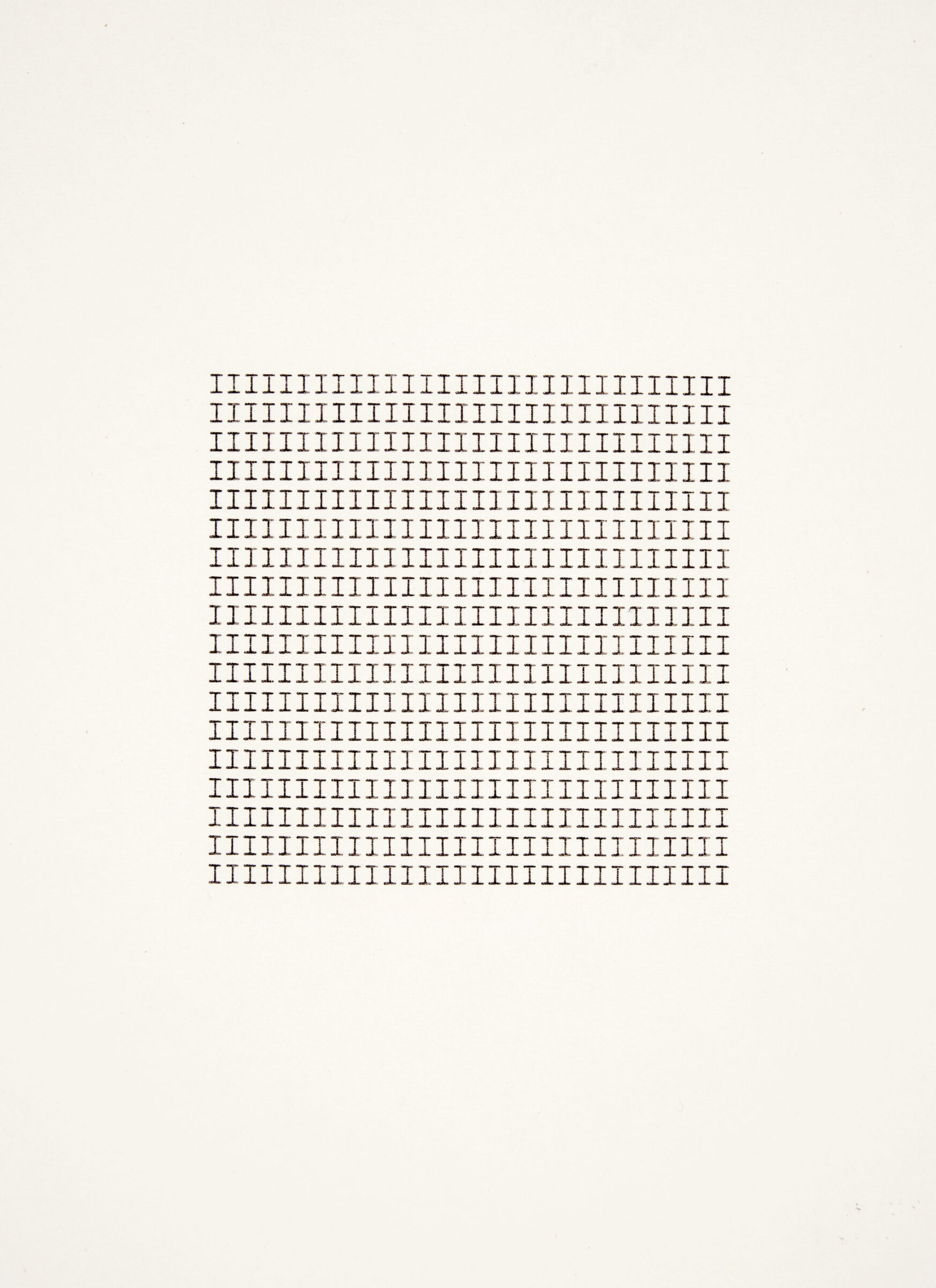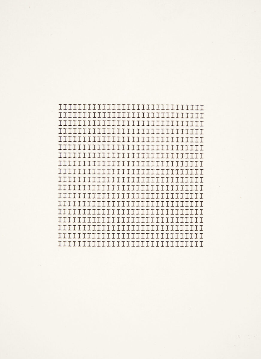 o.T. (TY-117). Schreibmaschine auf Papier. 1965. 7,7 x 7,7 (Blatt: 24 x 21) cm, unter Passepartout. Unter Glas gerahmt.