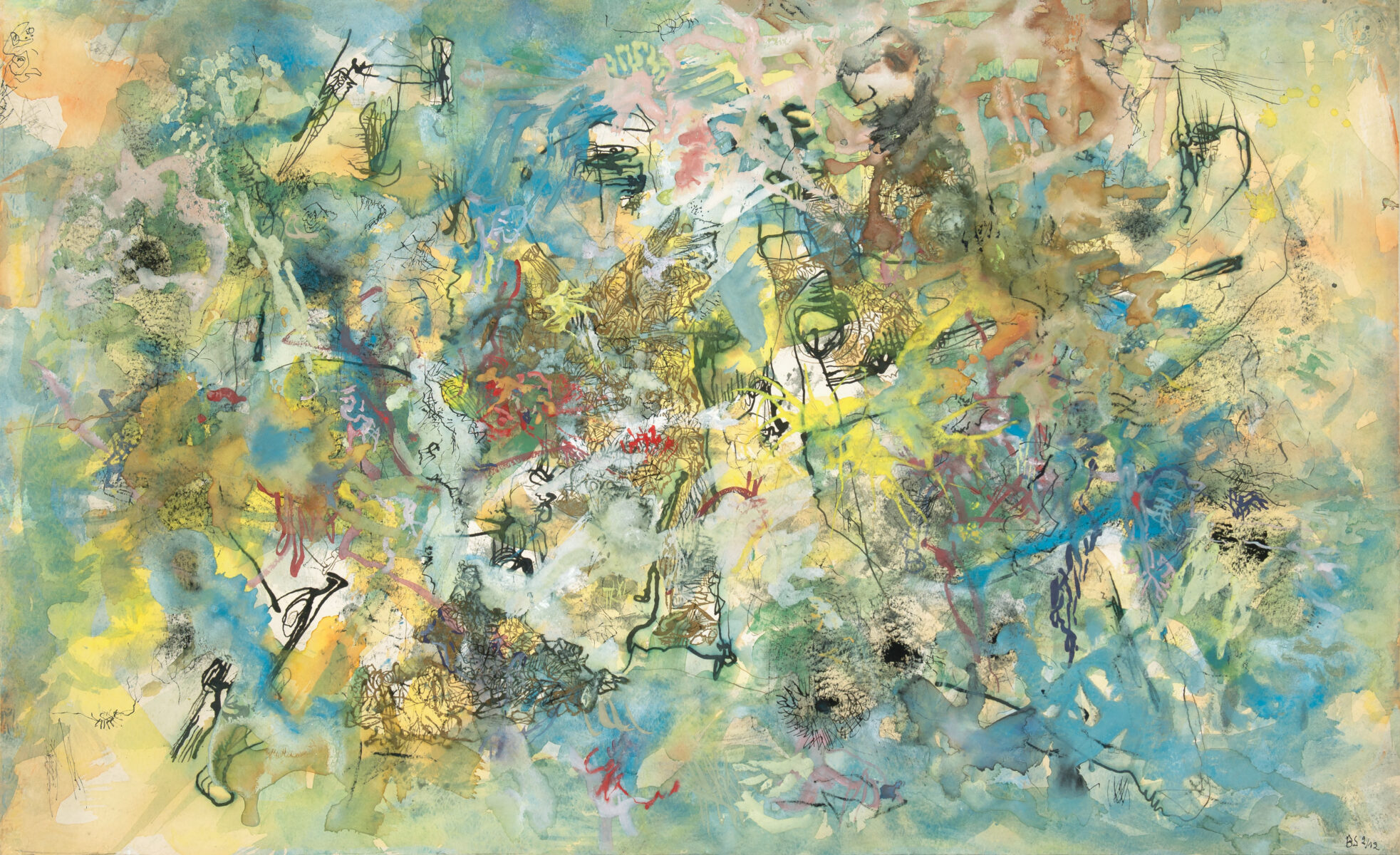 o.T. (Komposition). Mischtechnik (Aquarell, Gouache, Bleistift, schwarze Kreide, Pinsel in Tusche) auf chamoisfarbenem Schoellershammer Karton. 47,8 x 73 cm, im Passepartout freigestellt. Unter Glas gerahmt.