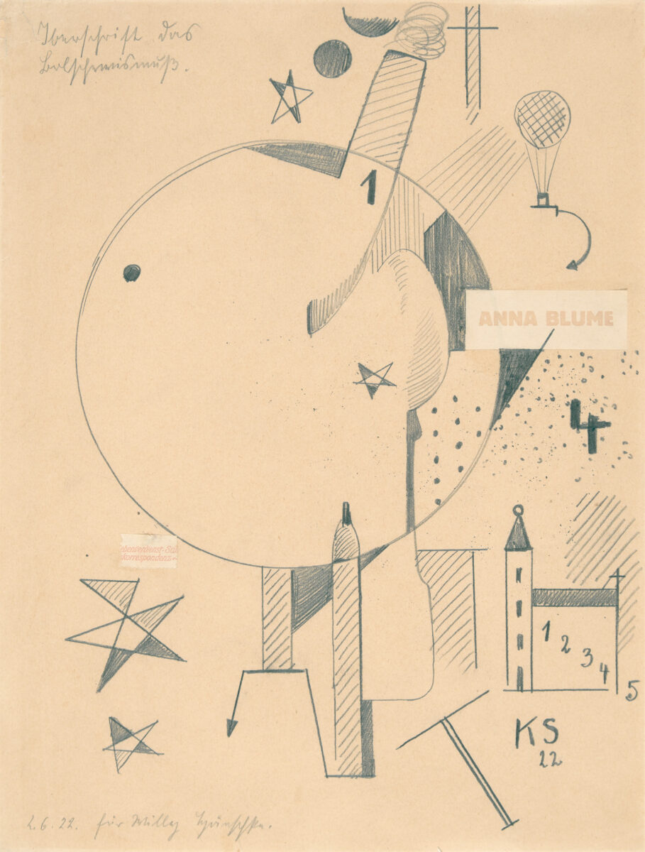 Orchard/Schulz 1080 (dort mit abweichenden Maßangaben) - Provenienz: Sammlung Willy Hänschke, Berlin (Geschenk des Künstlers 1922); 1978 Galerie Gmurzynska, Köln; 1980 Privatsammlung Norddeutschland; Privatsammlung Nordrhein-Westfalen. - Ausgestellt und abgebildet in: Kurt Schwitters. Köln, Galerie Gmurzynska, 1978, Katalog-Nr. 16, S. 42; Verboten - Verfolgt. Kunstdiktatur im 3. Reich. Kunsthalle Wilhelmshaven u.a., 1983, S. 159 (dort betitelt "Anna Blume/Das Bolschewismus") sowie in: Kurt Schwitters. Hannover, Sprengel-Museum, 1986, Katalog-Nr. 52, S. 129. - Insgesamt leicht gebräunt. Der linke Blattrand mit leichten, teils hinterlegten Randläsuren.