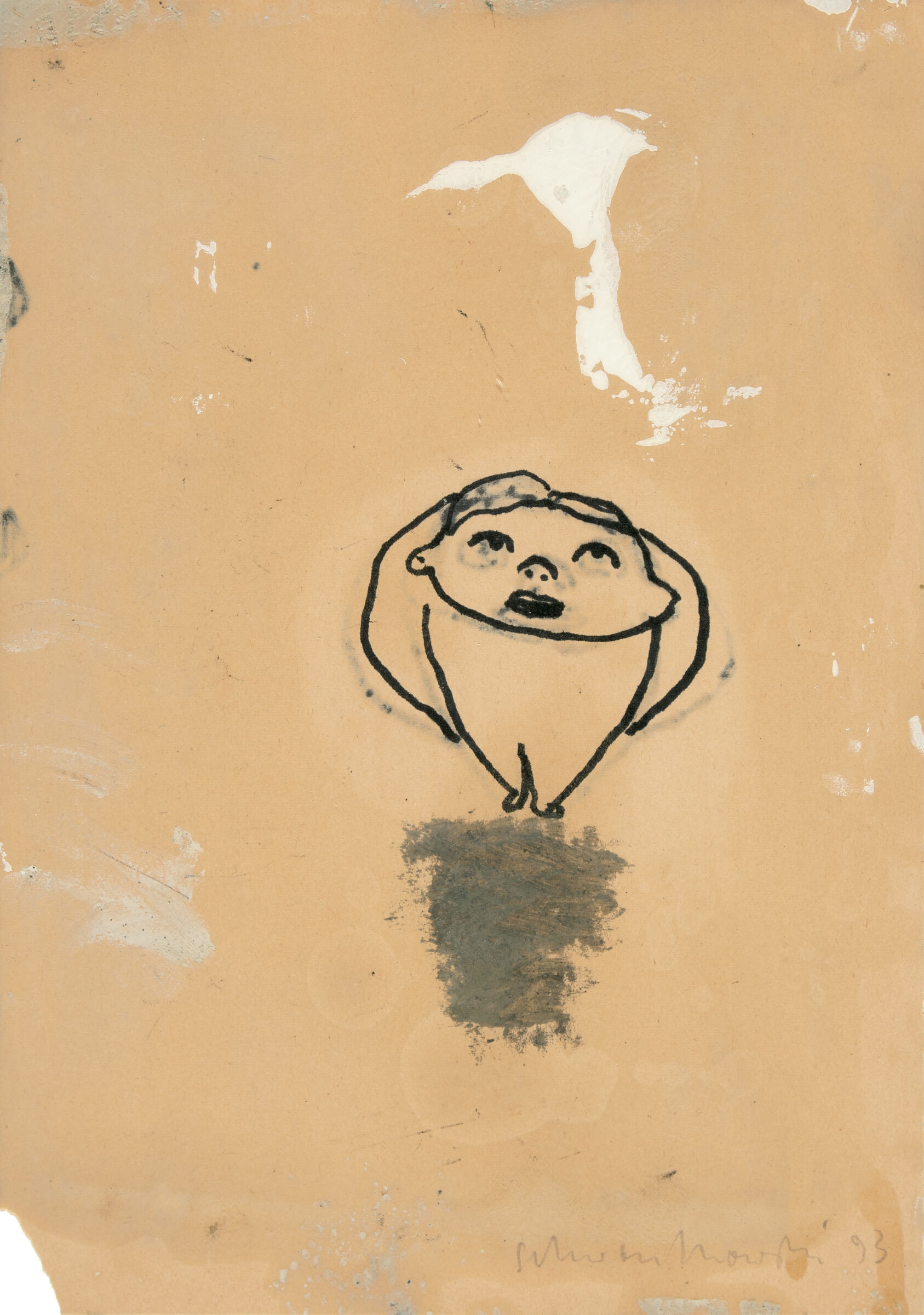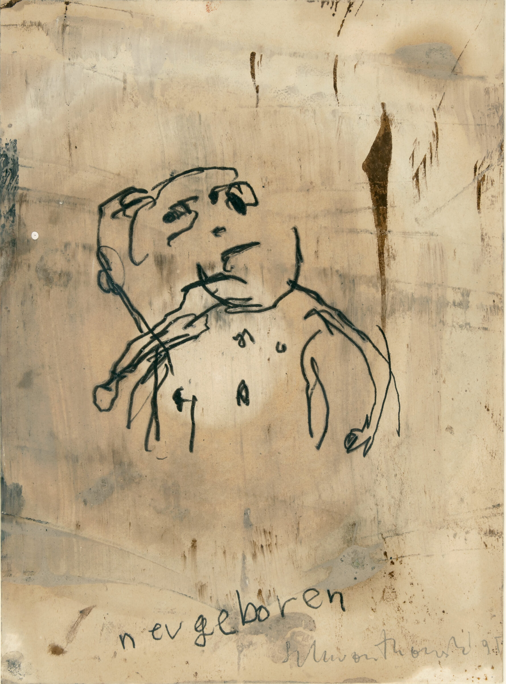 Kleiner Mann - neugeboren. Zwei Blatt. Mischtechnik auf bräunlichem Papier bzw. Papier. 1993/95. 29,8 x 21 bzw. 30 x 22 cm. Jeweils unter Glas gerahmt.