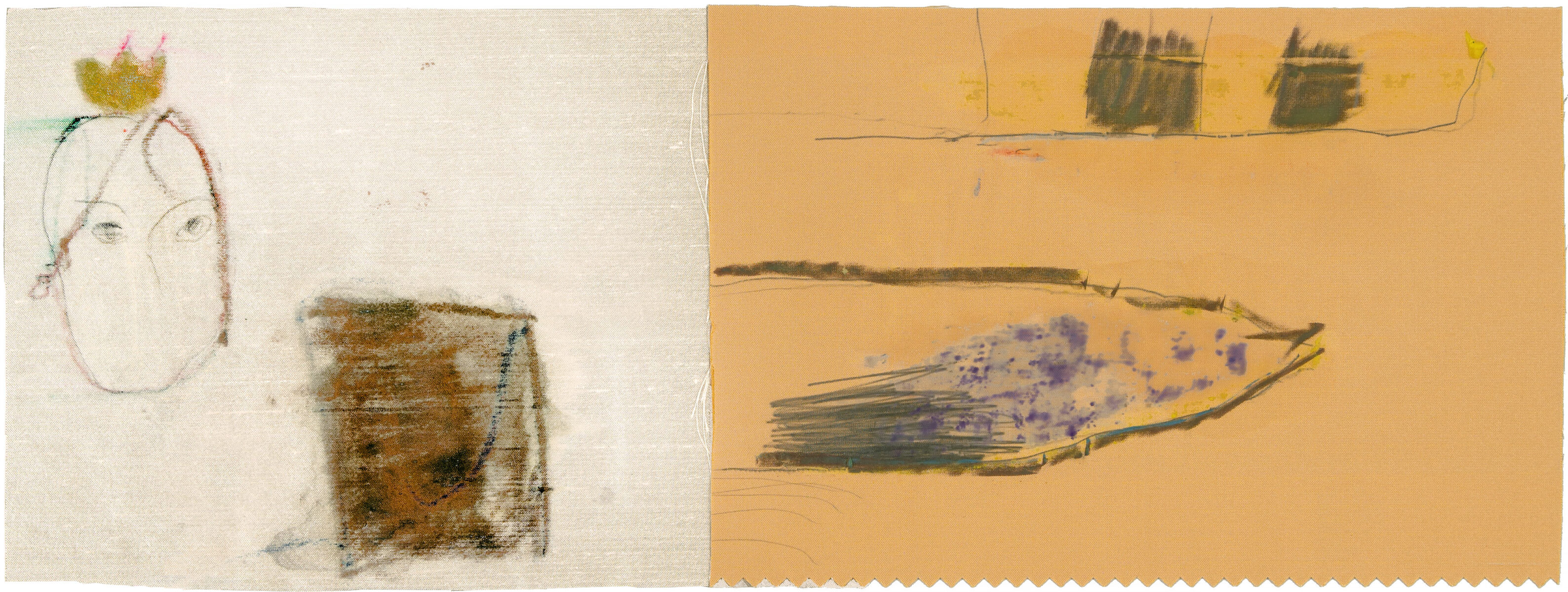 o.T. (Prinzessin und Fisch). Mischtechnik (Öl, Goldfarbe, Ölkreide, Bleistift) auf zusammenmontierten Stoffstücken. 16 x 42,5 cm. Unter Glas gerahmt.
