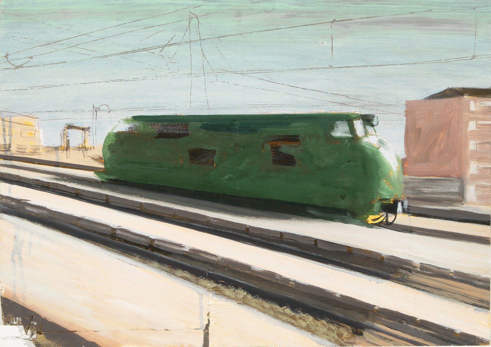 o.T. (Lokomotive in Landschaft). Öl auf Schichtholz. 1987. 43,5 x 62 cm.