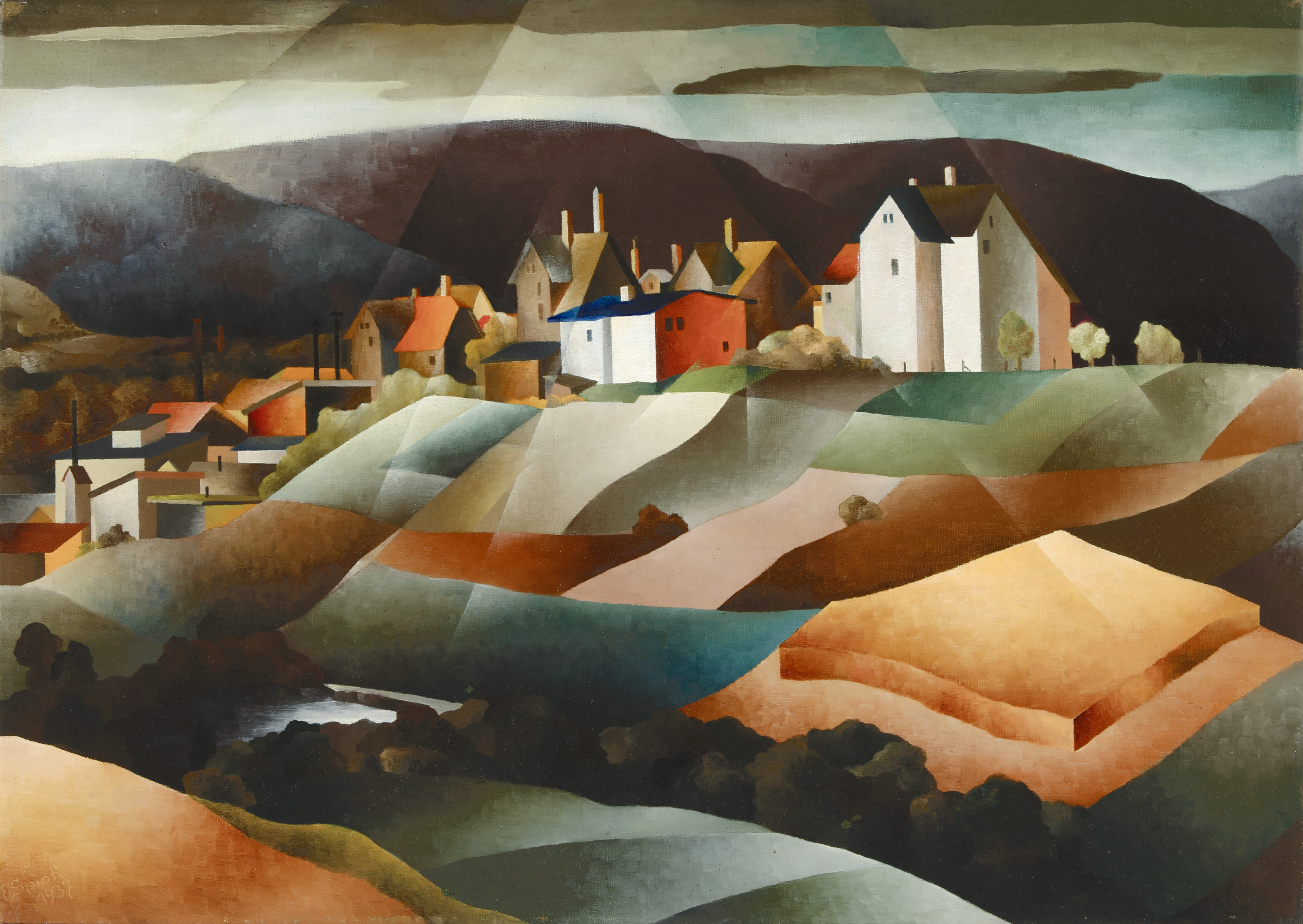 Dorf in hügeliger Landschaft. Öl auf Leinwand. 1937. 49,5 x 70 cm. Gerahmt.