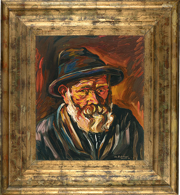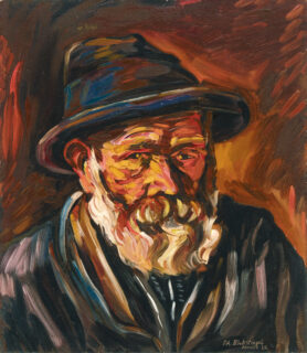 Riedel 186 - Provenienz: Privatsammlung Wiesbaden; Hauswedell & Nolte, Hamburg, Auktion 315 am 01.12.1995, Katalog-Nr. 47, dort vom Vorbesitzer erworben (Rechnung in Kopie beigegeben). - Sein Vater war für Böckstiegel weit mehr als bloß Modell - in ihm verdichtete sich eine ganze Lebenswelt, geprägt von harter Arbeit und stiller Würde. Eindrücklich offenbart das Porträt den Kern von Böckstiegels künstlerischem Schaffen: die tiefe Verbundenheit mit seiner westfälischen Heimat und ihren Menschen. - Mit kräftigem, pastosem Farbauftrag und expressivem Pinselduktus steigerte der Künstler das Antlitz des alten Mannes zu einem nahezu monumentalen Charakterkopf. Leuchtendes Rot, erdiges Braun, Gelb, Weiß und dunkles Blau überlagern sich in grob modellierten Partien und verleihen dem zerfurchten Gesicht eine eindringliche, beinahe plastische Präsenz. Der freie, dynamische Pinselstrich vermittelt einen Eindruck von Unmittelbarkeit und Spontaneität und verleiht der Figur Lebendigkeit. Diese Wirkung wird durch den vom Künstler aufwendig gestalteten Rahmen maßgeblich intensiviert. Er fungiert nicht nur als Einfassung, sondern als bewusstes kompositorisches Element, das den Blick bündelt und die expressive Kraft des Porträts nachhaltig steigert. Die vertiefte Auseinandersetzung mit den Bildnissen seiner Eltern schilderte Böckstiegel selbst eindringlich: "Meine Eltern als erdverbundene Menschen, die unermüdlich ihr ganzes Leben lang mit ausdauerndem Fleiß und größter Liebe ihr Ackerland in Arrode bebauten, wurden mir in meiner Arbeit als Künstler zum Träger, zum Sinnbild des Menschentums. Die Sorgen des Lebens, die harte Arbeit im Haus und in der Natur gruben tiefe Runen in die Gesichter, machten sie kernhaft und stark, formten Geist und Seele zu erhabener Einheit. [...] Eine große Anzahl von diesen Werken haben in Museen und Privatsammlungen Platz gefunden. Sie leuchten in einer starken, strahlenden Farbe, einer schweren, gebundenen Form, tiefem seelischen Ausdruck, 'alles Erdnähe', als feste, große, plastische Gestalten stehen Sie klar umrissen im Bilde, sehen den Beschauer an." (Böckstiegel, Wie ich als Maler zu der Gestaltung der Plastik kam, in: Deutsche Frauen-Zeitung, 45, Nr. 3, Leipzig 1932) Mit dem Machtantritt der Nationalsozialisten änderte sich die Lebens- und Arbeitssituation Böckstiegels dramatisch. Seine expressionistische Bildsprache entsprach nicht dem propagierten Kunstideal des Regimes, so dass zahlreiche Werke im Zuge der Aktion "Entartete Kunst" aus öffentlichen Sammlungen entfernt wurden. Die Bombardierung Dresdens im Februar 1945 bedeutete einen weiteren schweren Einschnitt, denn sein Dresdner Atelier wurde zerstört und mit ihm gingen viele Arbeiten unwiederbringlich verloren. - Der Rahmen verso mit einem Etikett des Kunsthauses Schaller, Stuttgart. - Vereinzeltes minimales Craquelé.