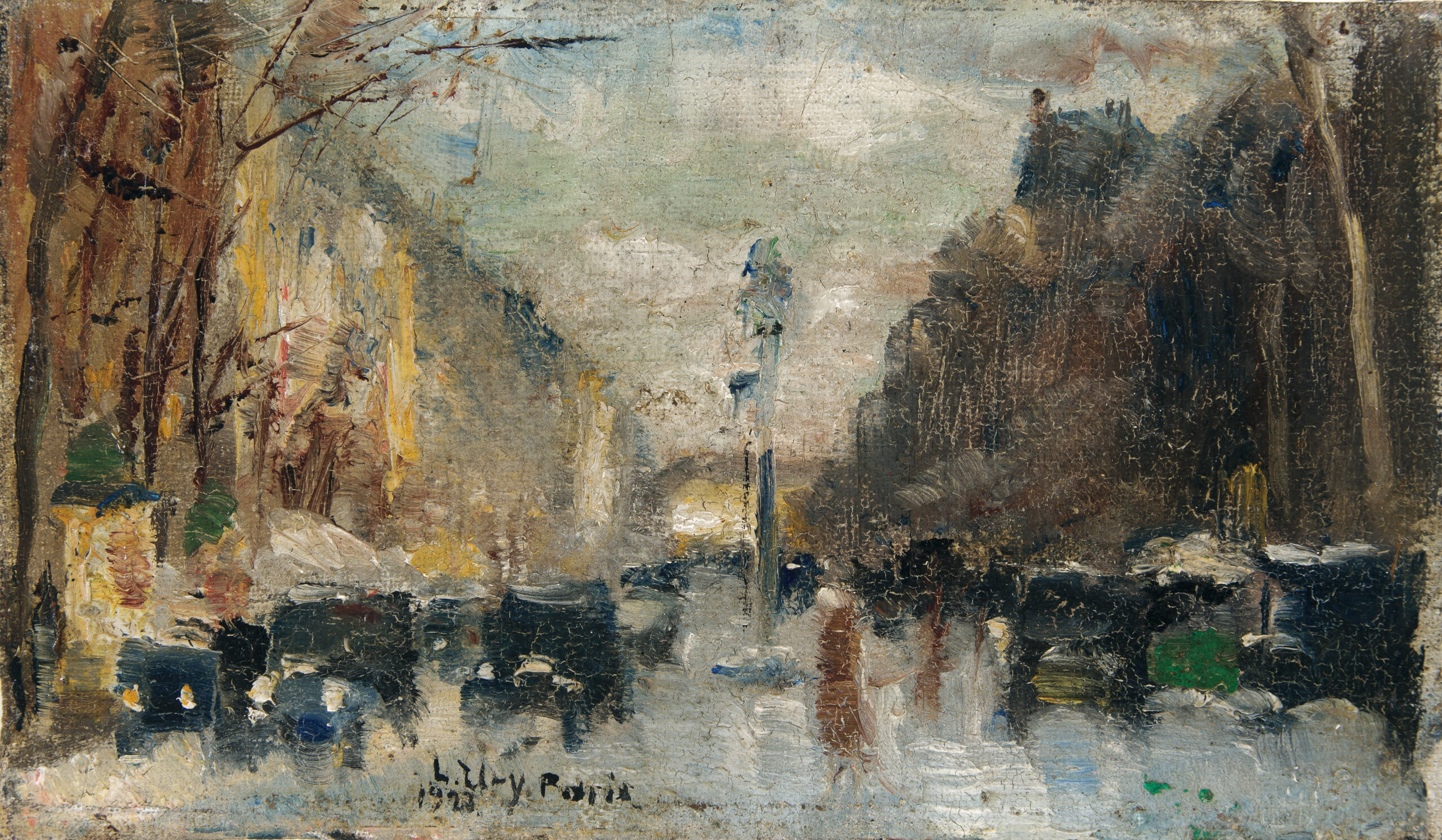 Die Arbeit wird in das in Vorbereitung befindliche Werkverzeichnis von Dr. Sibylle Groß aufgenommen. Wir danken ihr für die freundlichen Auskünfte. - Provenienz: Privatsammlung USA bis 1983; Privatsammlung Hamburg; 2010 Grisebach, Berlin, dort vom Vorbesitzer erworben (Rechnung in Kopie beigegeben). - Ausgestellt und abgebildet in: Lesser Ury. Zauber des Lichts. Berlin, Käthe-Kollwitz-Museum, 1995/96, Katalog-Nr. 60, S. 154. - Seit dem letzten Jahrzehnt des 19. Jahrhunderts schilderte Ury in seinen Werken gerne das Lebensgefühl moderner Metropolen. Eine bezaubernde Verdichtung der typischen Großstadtmotive gelang ihm gerade im kleinen Format, in welchem er mit spontanem Pinselduktus und pastosem Farbauftrag die pulsierende Atmosphäre der Straßen von Paris einfing: "Drei Städte haben bis jetzt Lesser Urys Interesse auf sich gezogen: 1926: London, 1928: Paris; Berlin, in dem er lebt, hat seine Liebe immer gehabt. Paris ist die letzte Station dieser Reisen und mithin die vollkommenste. Die Pariser Bilder sind im März gemalt, diesem Monat der kühlen, klaren und dabei ganz zarten Farben. [...] Ury liebt seinen Gegenstand, nicht sich. Er liebt Paris, nicht sein eigenes Leben in der Stadt. Und so malt er - als erster moderner Maler - wieder Veduten, Stadtbilder. Er malt im Schimmer des Morgenlichtes die Brücken über der Seine, malt den weiten Blick von den Tuilerien zum Triumphbogen, die Automobilreihen an der Opéra [...]. Er malt Paris, wie die Venetianer ihr Venedig, mit all' dem farbigen Duft, der für den Maler die Atemluft einer Stadt ist. Das Märzlicht von Paris ist zart, als streife die Sonne die Stadt nur im Vorüberschreiten mit ihrem leuchtenden Saum. Und jedes Bild variiert es auf neue Weise über neuen Straßen." (Ernst Cohn-Wiener, Der Maler Lesser Ury, in: Lesser Ury. Neue Bilder aus zwei Weltstätten. Berlin, Kunst Kammer Martin Wasservogel, 1928, S. 7) - Im Strudel der Fahrzeuge auf regennasser Fahrbahn wird der Betrachter in die Tiefe des Bildraumes gezogen. Erst nach und nach entdecken wir die ersten Sonnenstrahlen in der linken Bildhälfte, die Litfaßsäule, die kahlen Bäume und die Passantin im Mantel, die Straße querend, die rechterhand noch im undefinierbaren Schatten liegt. Urys Stadtbilder sind keine realen Straßenszenen, obwohl sie Wiedererkennbares darstellen, sondern vielmehr atmosphärische Erlebnisse von Stadt und Natur, in denen sich ein vom Gegenstand losgelöstes Kolorit dem emotionalen Moment dienlich macht. Seine Lust an Perspektive und die delikate malerische Behandlung der Farben zeichnen Urys meisterliches Talent aus. - Minimales Craquelé.