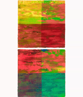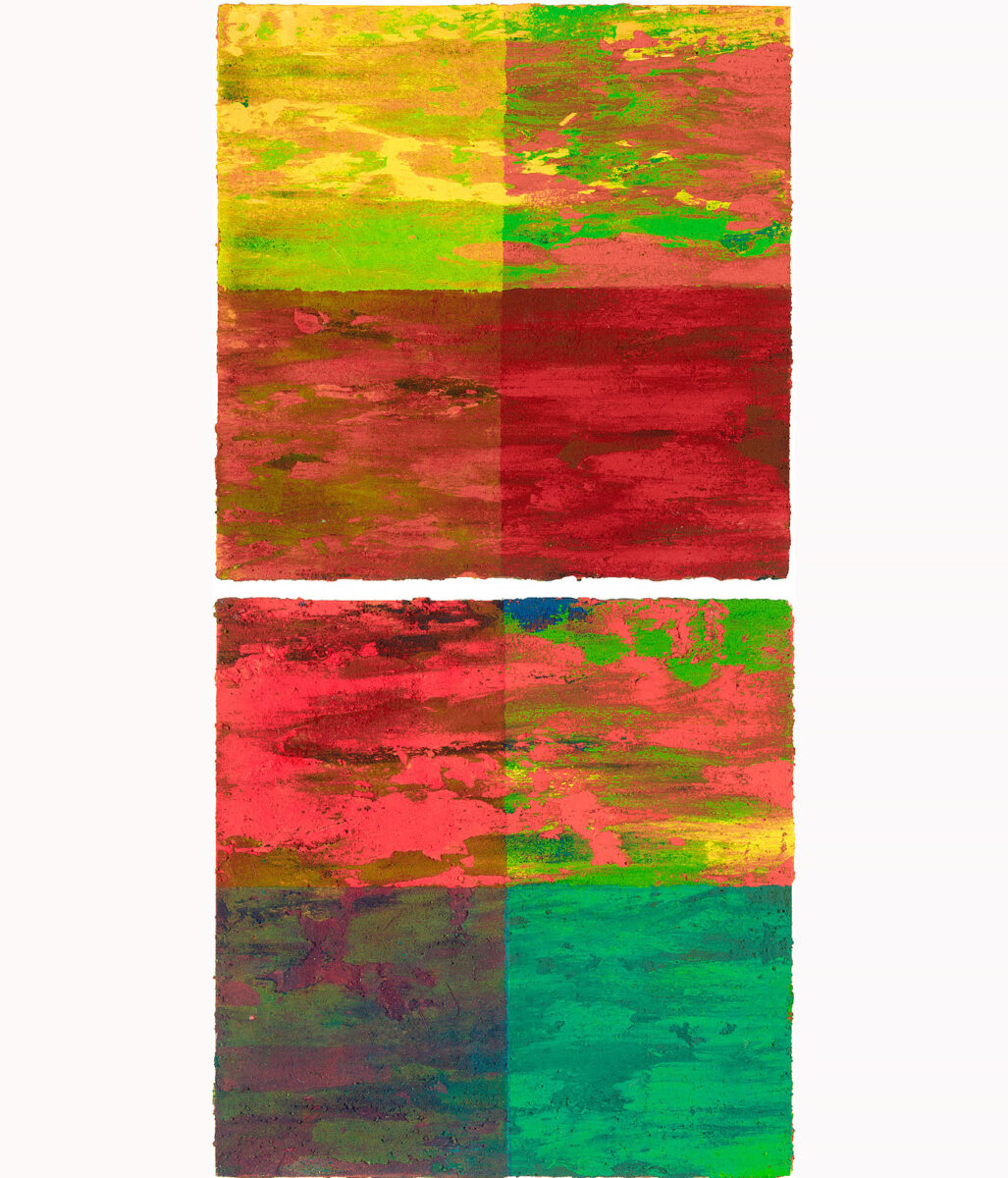 o.T. Zwei Gemälde. Acryl u. Putzmörtel auf Holz. 2006. Jeweils 50 x 50 cm.