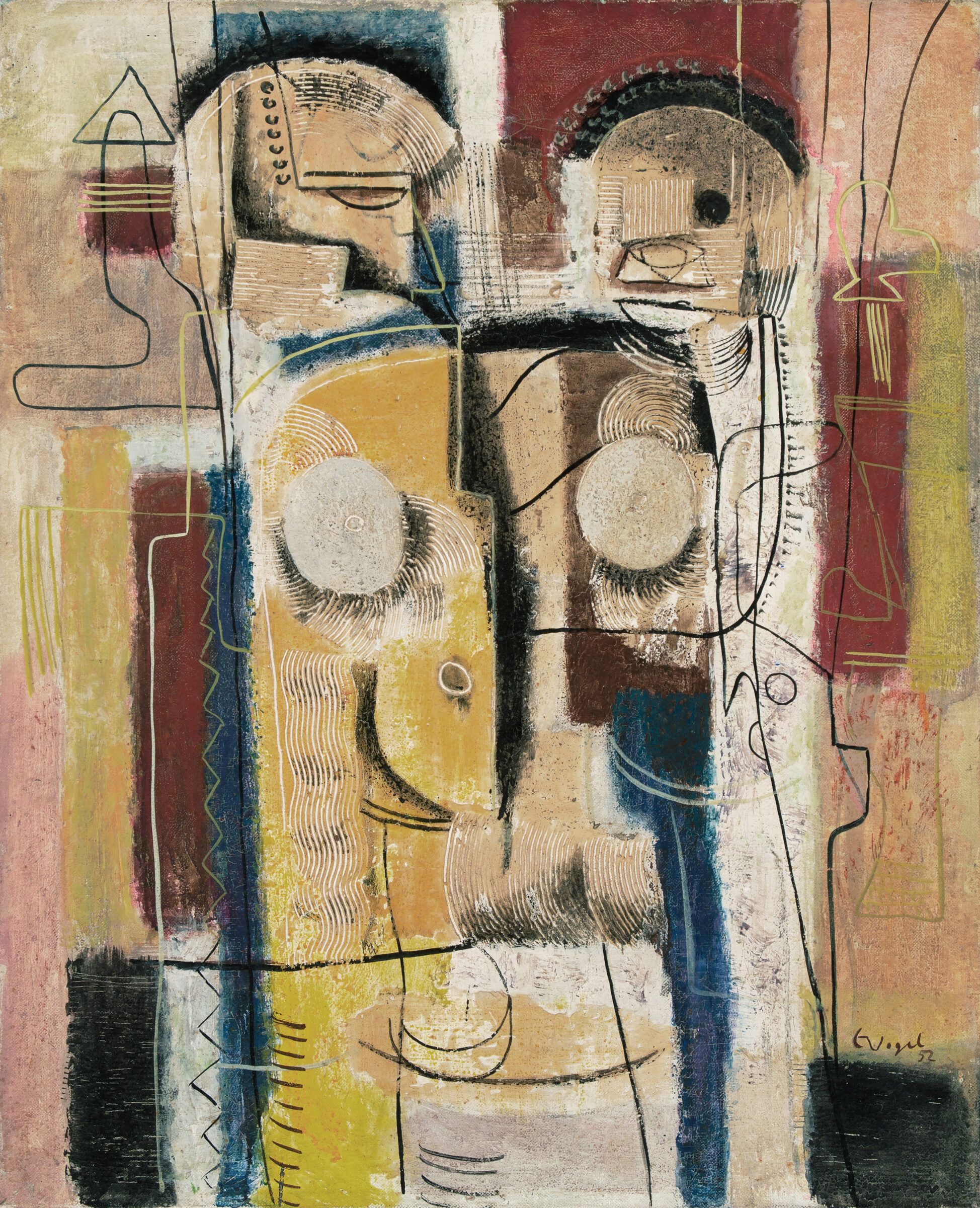 Provenienz: Vom Vorbesitzer in der Galerie Netuschil, Darmstadt, erworben (Schreiben beigegeben). - Ernst Vogel, seit 1927 Mitglied der Darmstädter Sezession, war ein faszinierender Grenzgänger der deutschen Nachkriegsmoderne. Der Titel unseres Gemäldes "Balante" verweist auf eine westafrikanische Ethnie und betont Vogels Interesse an außereuropäischen Kulturen und formalen Ursprüngen. In dieser kraftvollen Komposition verdichten sich zwei abstrahierte Figuren zu einem rhythmischen Dialog aus Linien, Flächen und Formen - ein Sinnbild für Begegnung und menschliche Verbundenheit. Das Werk entstand in Vogels reifer Phase und zeigt seine charakteristische Balance zwischen Figuration und Abstraktion. Die grafische Klarheit und strukturelle Tiefe spiegeln auch jene Prinzipien, die seine zahlreichen baugebundenen Arbeiten in Darmstadt prägen: Fresken, Metallreliefs und Mosaike, die das öffentliche Bild der Nachkriegszeit mitgestalteten. - Stellenweise leichtes Craquelé.