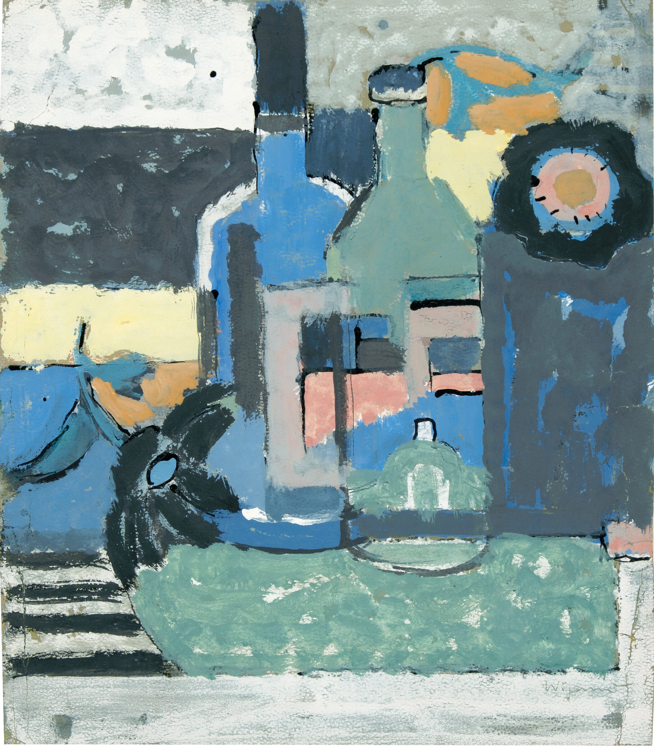o.T. (Stilleben mit zwei Flaschen). Gouache u. Pinsel in Tusche auf Karton. 31,7 x 28 cm, im Passepartout freigestellt. Unter Glas gerahmt.