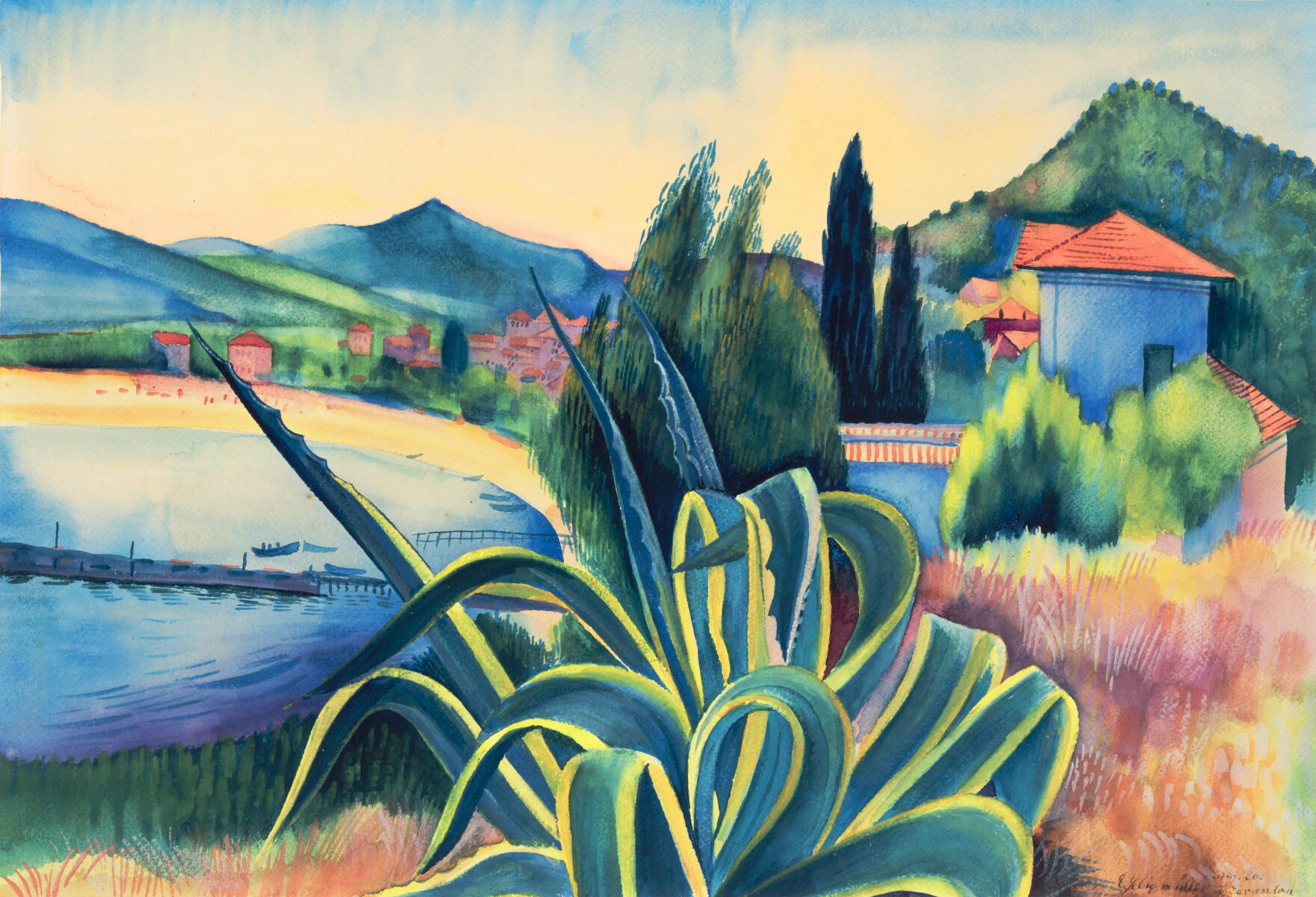 Le Lavandou (Bucht zwischen Marseille und Nizza). Aquarell auf Papier. 1926. 34,5 x 50,5 cm. Unter Glas gerahmt.