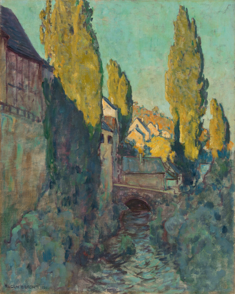 Wir danken Herrn Dr. Manfred Großkinsky, Karlsruhe, für die freundlichen Hinweise. - "Der Mühlgraben" liegt dem Registerbuch Brachts zufolge in Neudenau, einer kleinen Gemeinde nordöstlich von Bad Wimpfen, an der die Jagst vorbeifließt. Das Gemälde entstand im Oktober 1920 während einer Studienreise des Künstlers nach Hirschhorn am Neckar, von wo aus er Tagesausflüge in die nähere Umgebung unternahm. Von dem Motiv existiert auch eine verschollene Aquarellfassung von 1921 mit dem Titel "Vormittag am Mühlgraben".