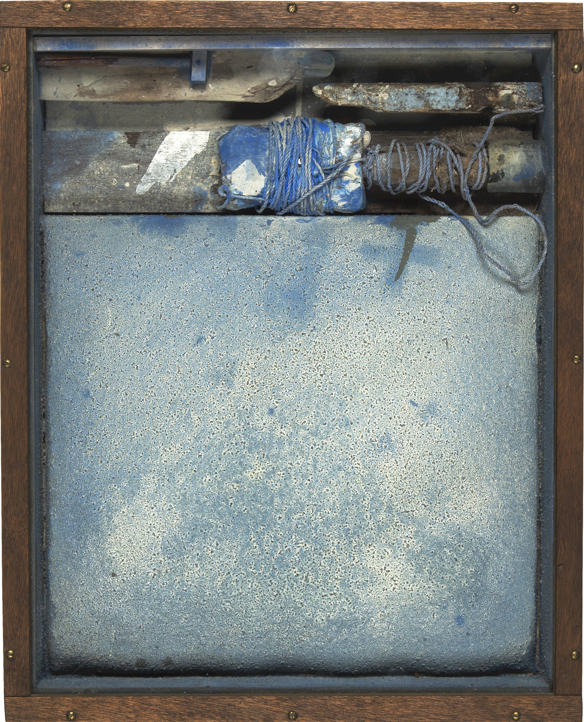 Verwaschenes Blau. Objektkasten. Assemblage mit Leinwand über Schaumstoff, blau gefasst, Holz, Kordel u. Nägeln. 1977. 43,5 x 35 x 8,5 cm.