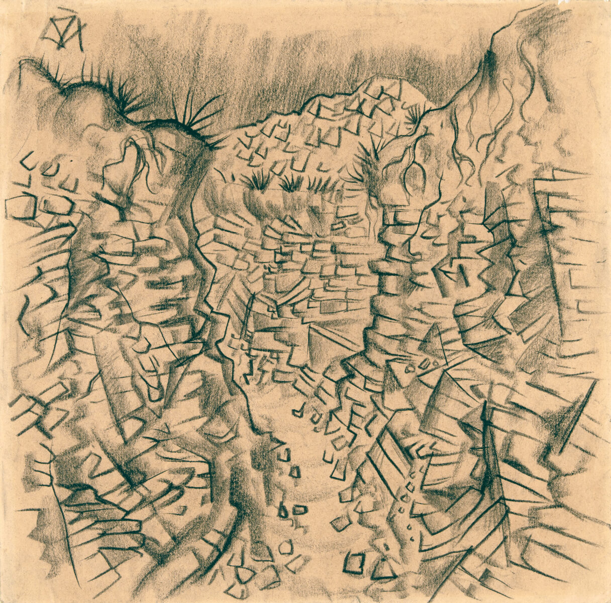 Graben in der Champagne. Schwarze Kreide auf bräunlichem Papier. 1915. 28,5 x 29 cm, unter Passepartout. Unter Glas gerahmt.