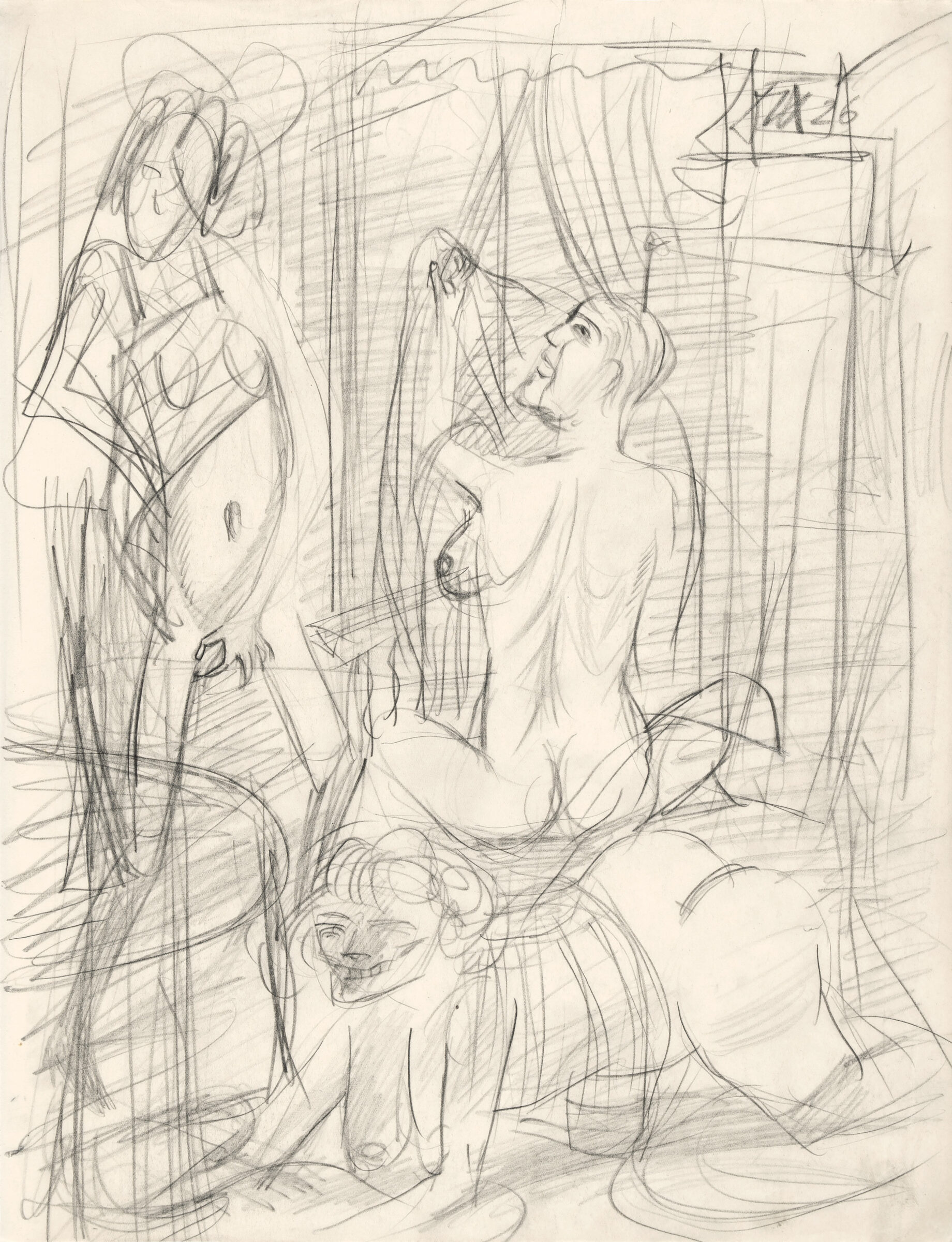 Studie zu "Drei Weiber". Bleistift auf Transparentpapier. 1926. 43 x 33 cm, im Passepartout freigestellt.