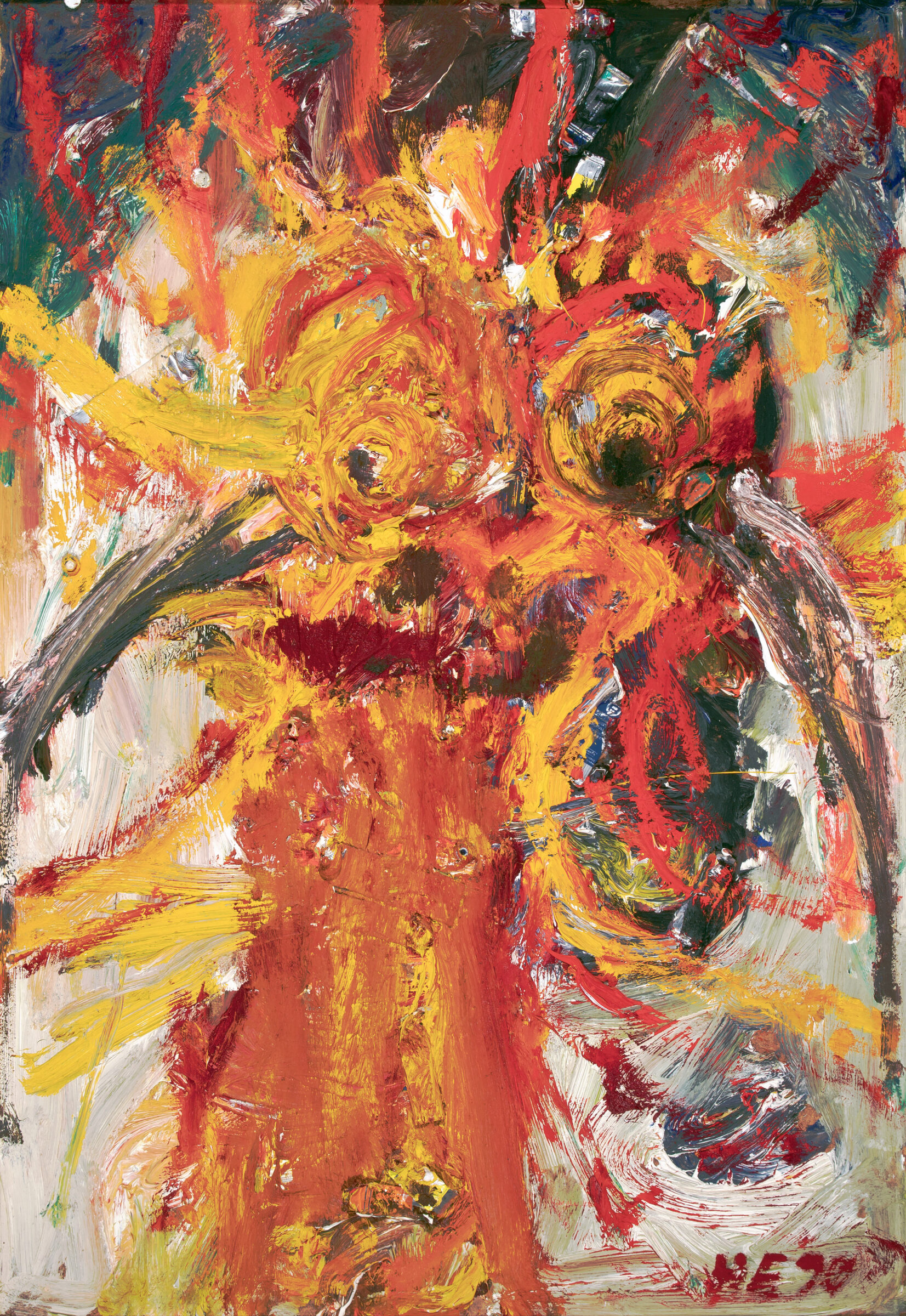Drachenspiel I. Öl u. Farbtuben auf Hartfaser. 1990. 130 x 90 cm. Im Original-Künstlerrahmen.