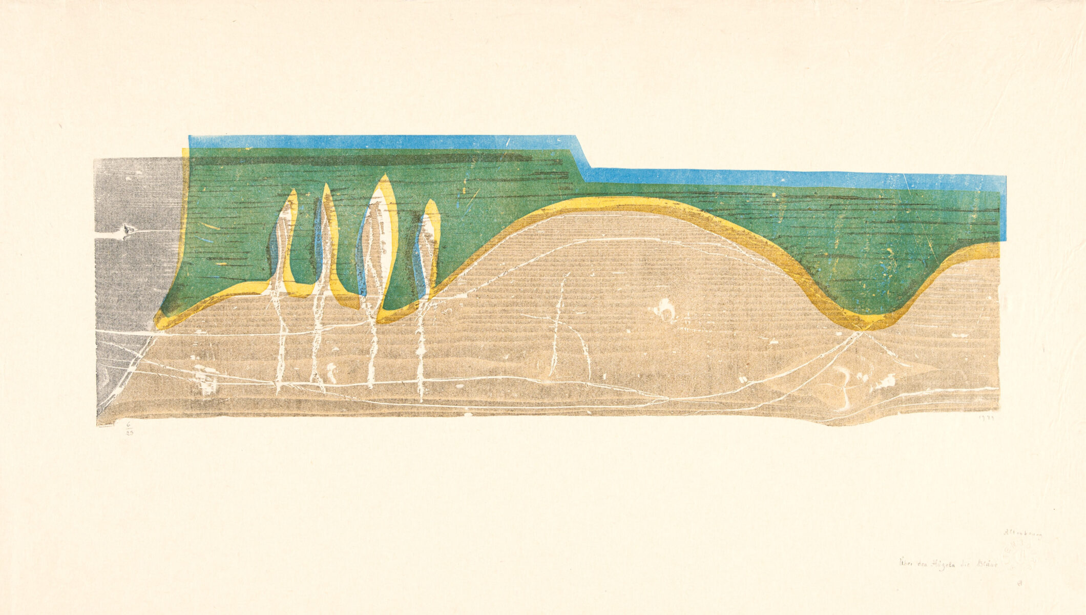 Über den Hügeln die Bläue. Farbholzschnitt auf chamoisfarbenem festen Japan. 1979. 18 x 56,5 (38,7 x 67,6) cm.