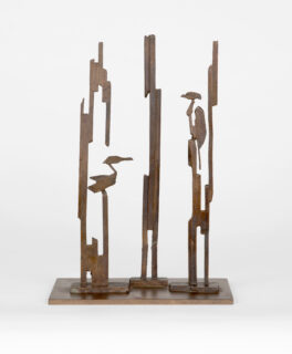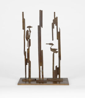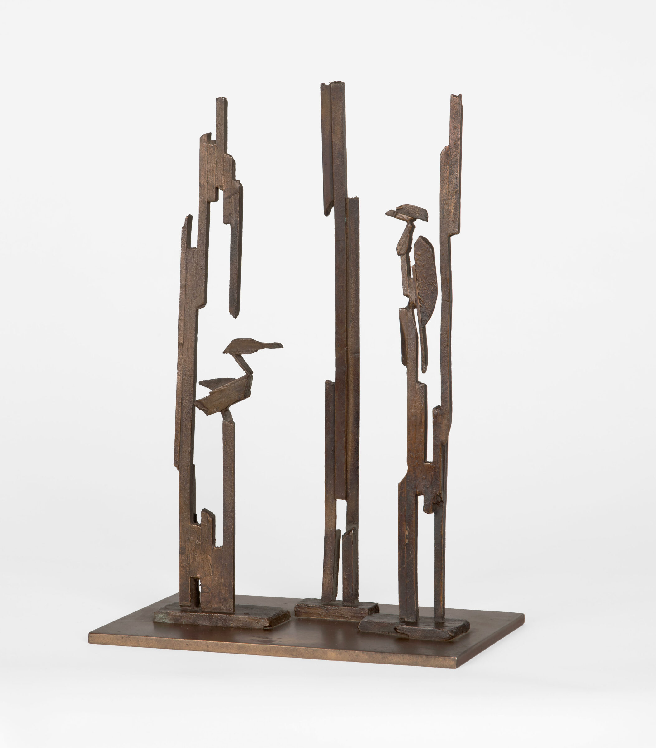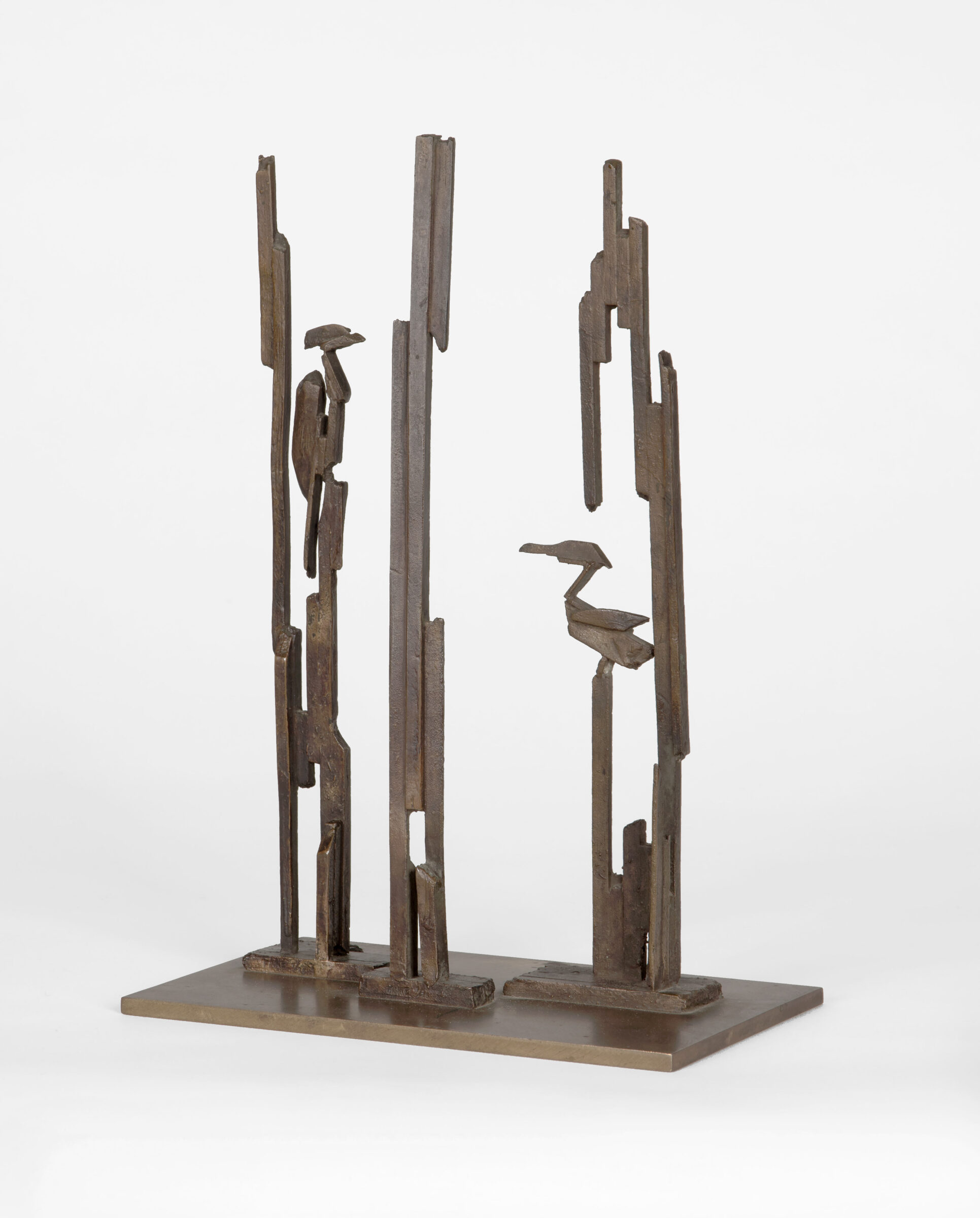 Reiher im Schilf. Bronze mit goldbrauner Patina. 28,6 x 16,5 x 5,6 cm. Auf Metallplatte montiert.