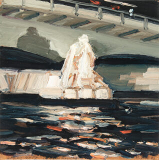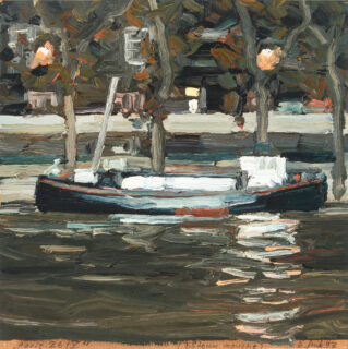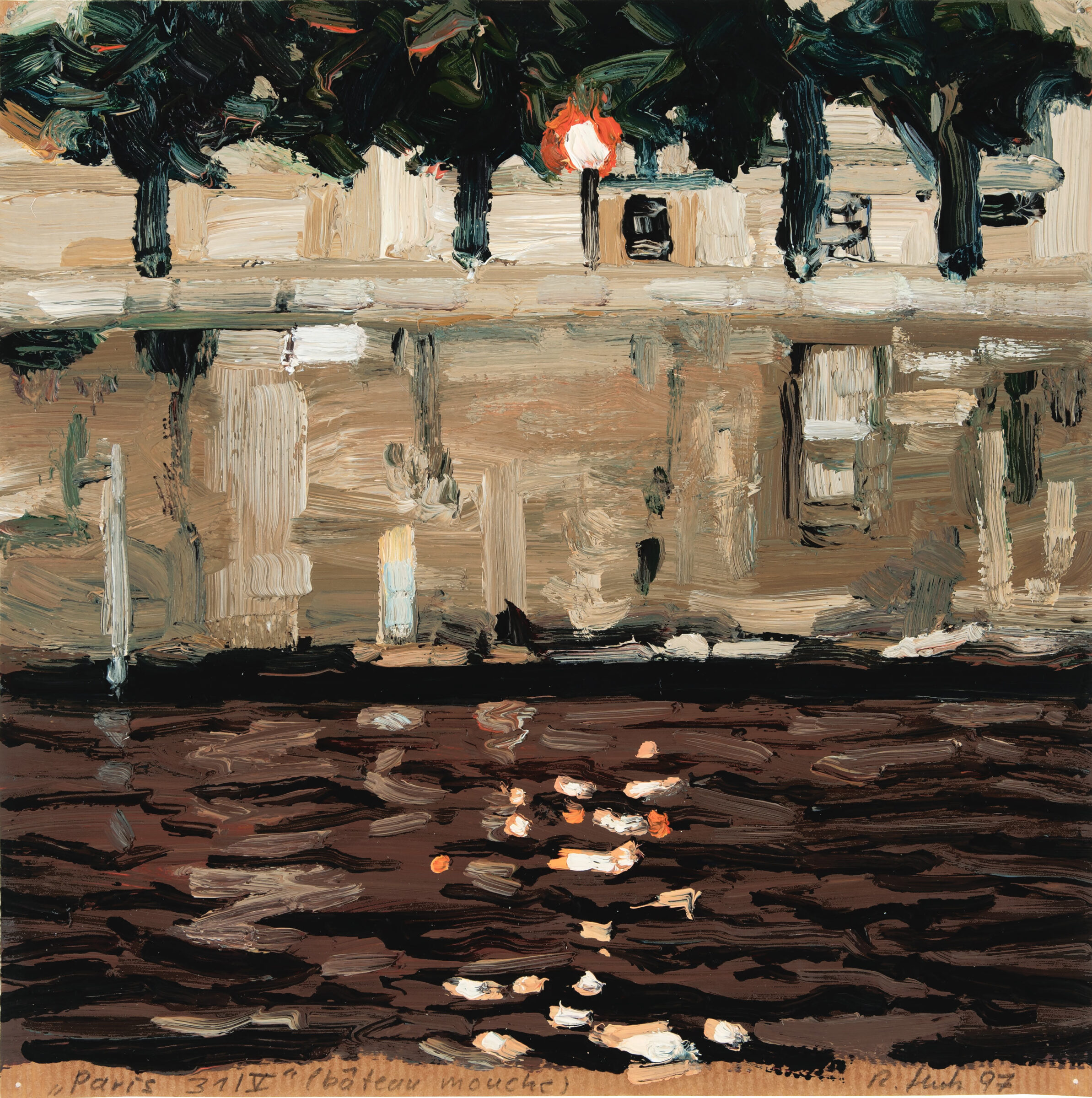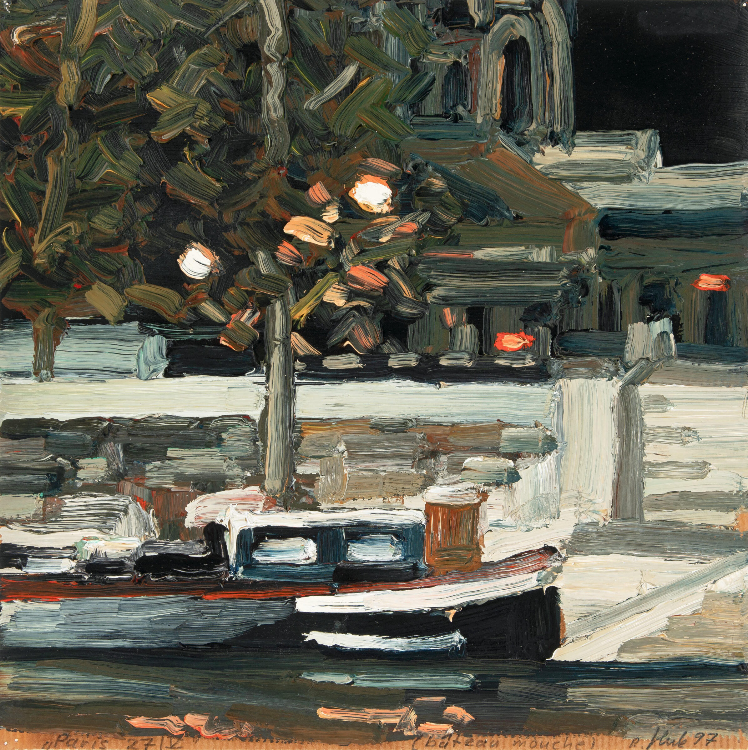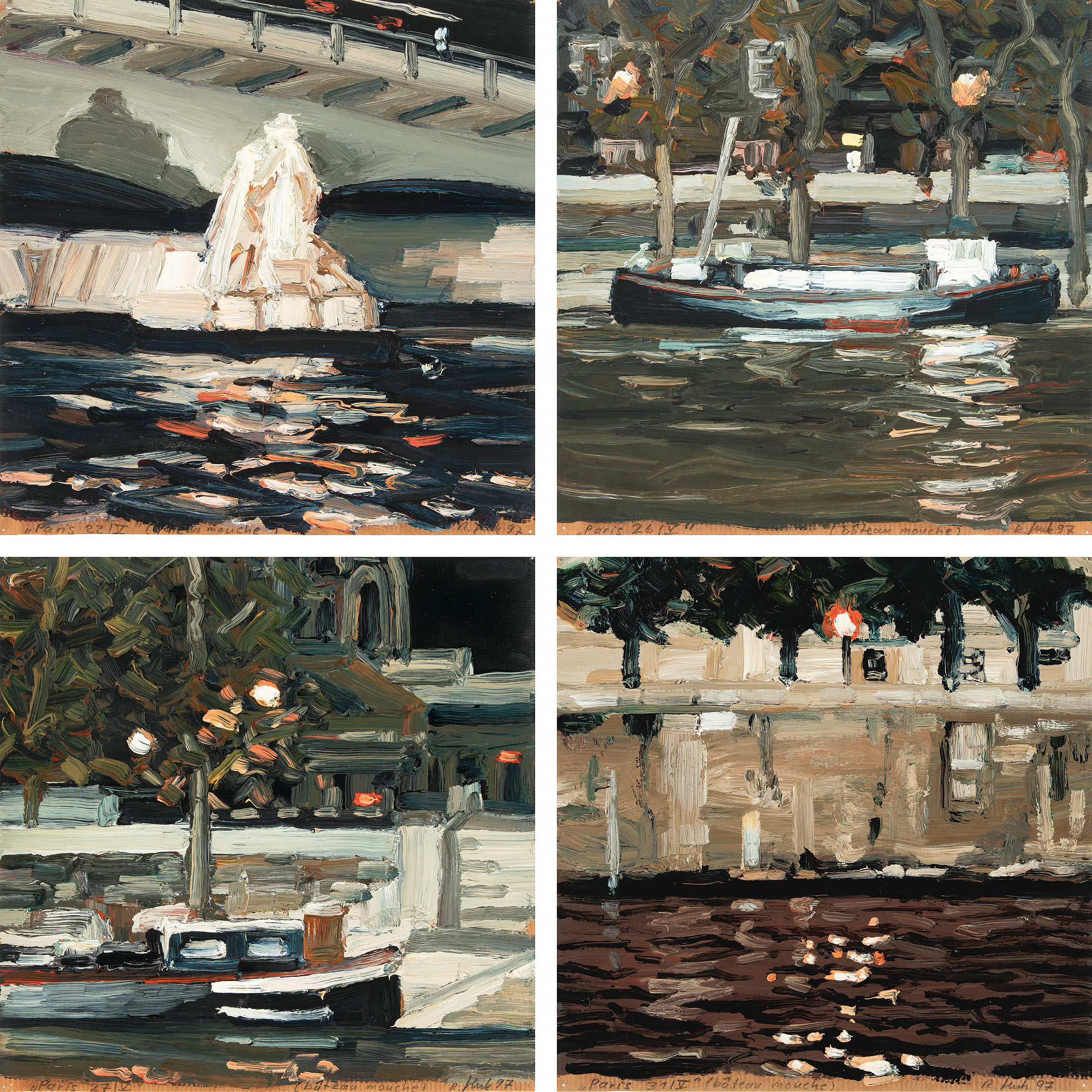Bateau Mouche (Paris). Folge von vier Arbeiten in Öl auf braunem Packpapier. 1997. Jeweils 25 x 25 cm. Jeweils im Passepartout freigestellt u. unter Glas gerahmt.