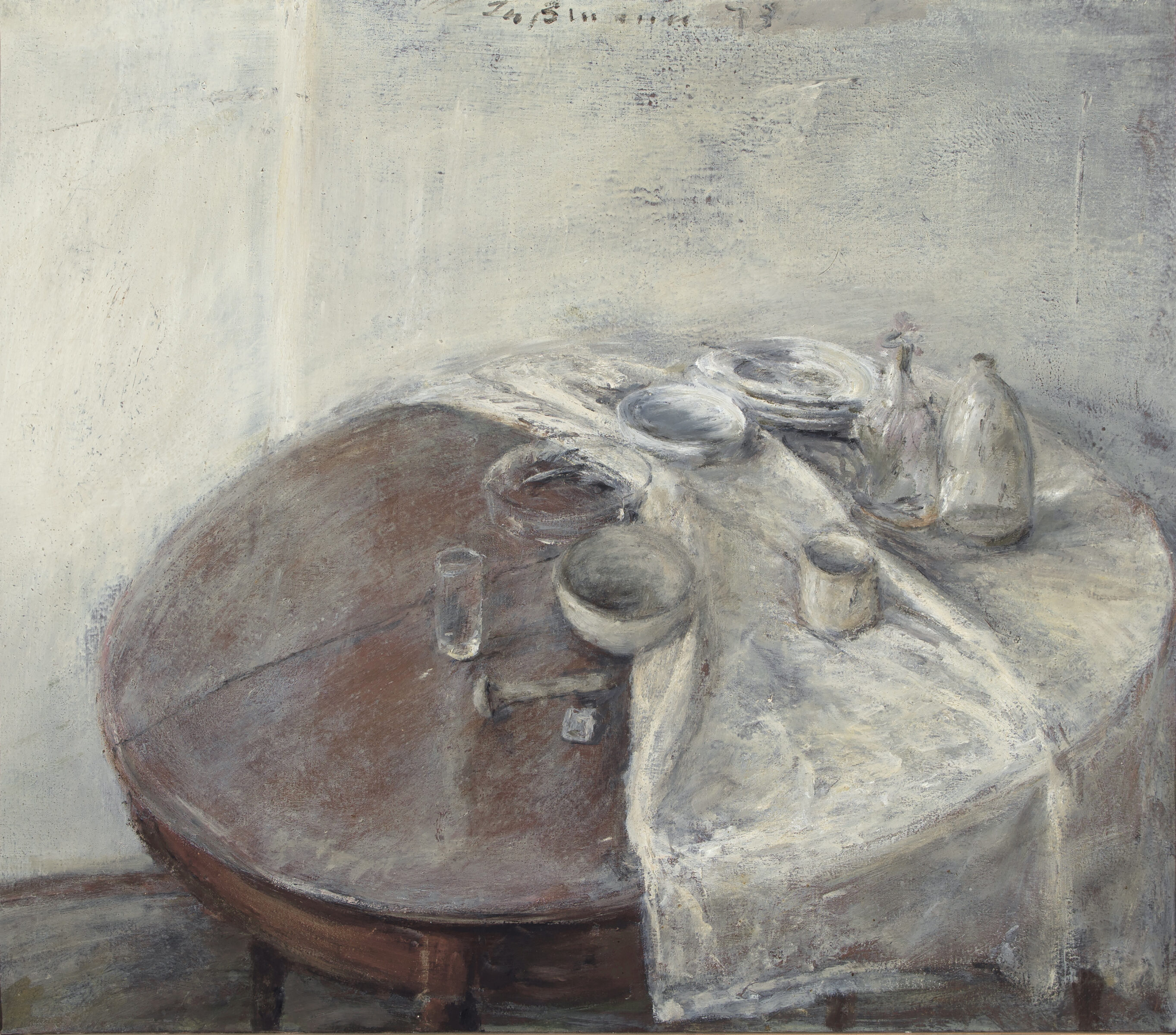 Seit den späten 1960er Jahren nutzt Klaus Fußmann das Tischstilleben als Ausgangspunkt für malerische Untersuchungen von Raum, Farbe und Komposition. Insbesondere in den 1970er Jahren entstanden Gemälde, in denen die Gegenstände weniger als detaillierte Einzelobjekte erscheinen, sondern mit Tischfläche und Hintergrund zu einer ruhigen, geschlossenen Bildwirkung verschmelzen. Charakteristisch ist dabei eine stark reduzierte, oft nahezu monochrome Farbigkeit in Grau-, Braun- und Ockertönen. Diese Beschränkung der Palette lenkt den Blick auf den malerischen Duktus und verleiht den Kompositionen eine stille, konzentrierte Atmosphäre.