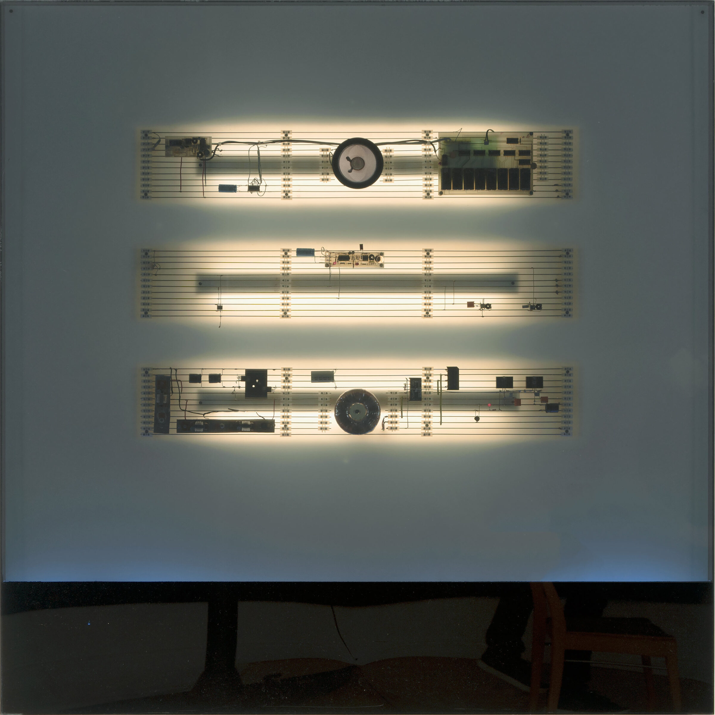 Geisterstimmen - Jenseitsdurchsage von Dr. Raudive. Elektrisch-akustisches Objekt. Ein Lautsprecher, drei elektrische Schaltkreise, Leuchtstoffröhren, Bauteile u. Kabel in Objektkasten aus getöntem Plexiglas. 1991. 120 x 120 x 6 cm.