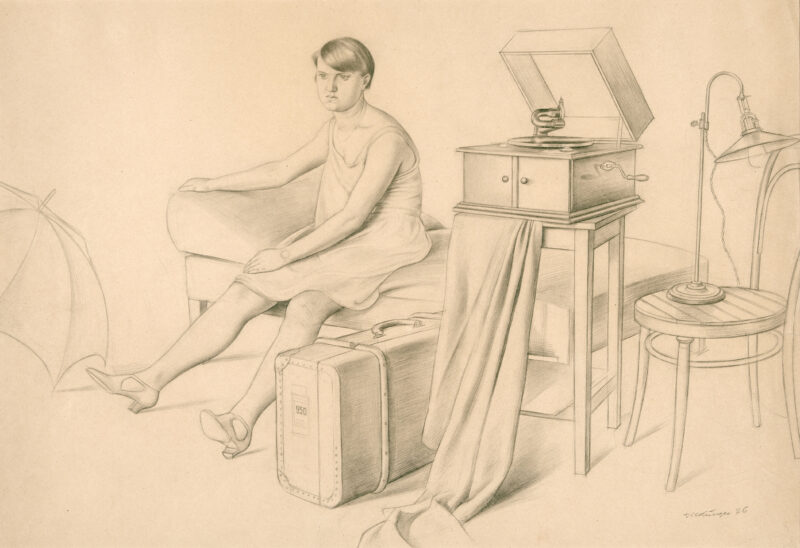 Weibliches Modell mit Grammophon. Bleistift auf bräunlichem leichten Karton. 1926. 44 x 62 cm, unter Passepartout. Unter Glas gerahmt.