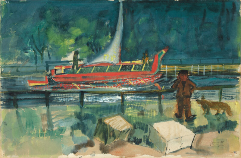 Das rote Schiff. Aquarell u. Gouache über Bleistift auf chamoisfarbenem Büttenkarton. 1925. 31 x 47 cm, im Passepartout freigestellt. Unter Glas gerahmt.