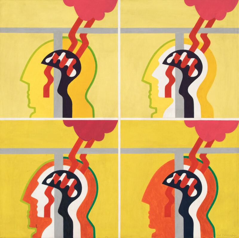 Blumenbergs Formensprache verweist auf Einflüsse aus der konkreten Kunst und der Pop Art, bleibt jedoch ambivalent zwischen Abstraktion und Narration verortet. Das Werk steht exemplarisch für das Interesse der Künstlerin an kognitiven und emotionalen Zuständen, die sie in ein formal stringentes, gleichzeitig aber hochgradig assoziatives Bildsystem überführt. In ihrem Werk reflektiert Blumenberg, die an der Fachschule für Stahlwaren-Industrie in Solingen Formgestaltung studiert hatte, zentrale Fragestellungen der späten 1960er Jahre: die Auflösung des Subjekts, die Serialität als Erkenntnisform und die Schnittstelle zwischen Technik, Geist und Bild. - Die Leinwand mit einer kleinen Läsur.